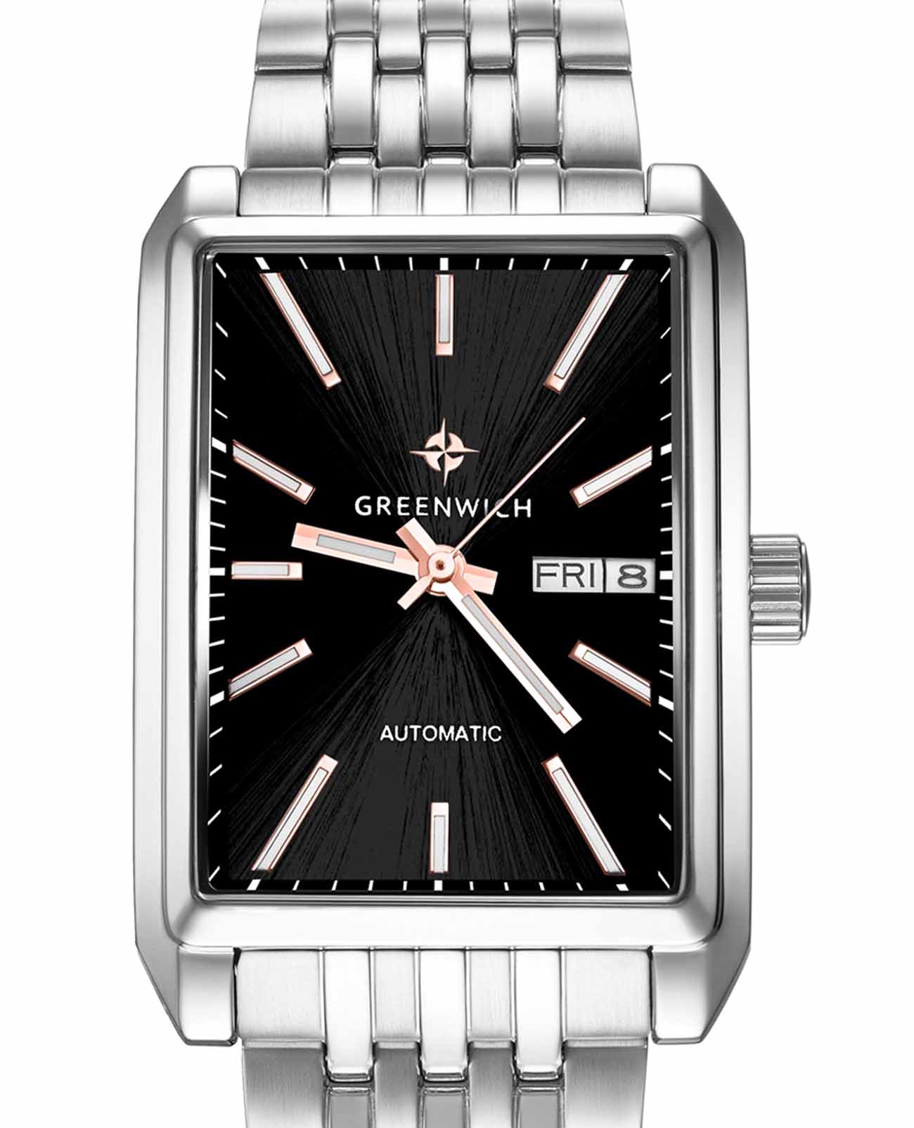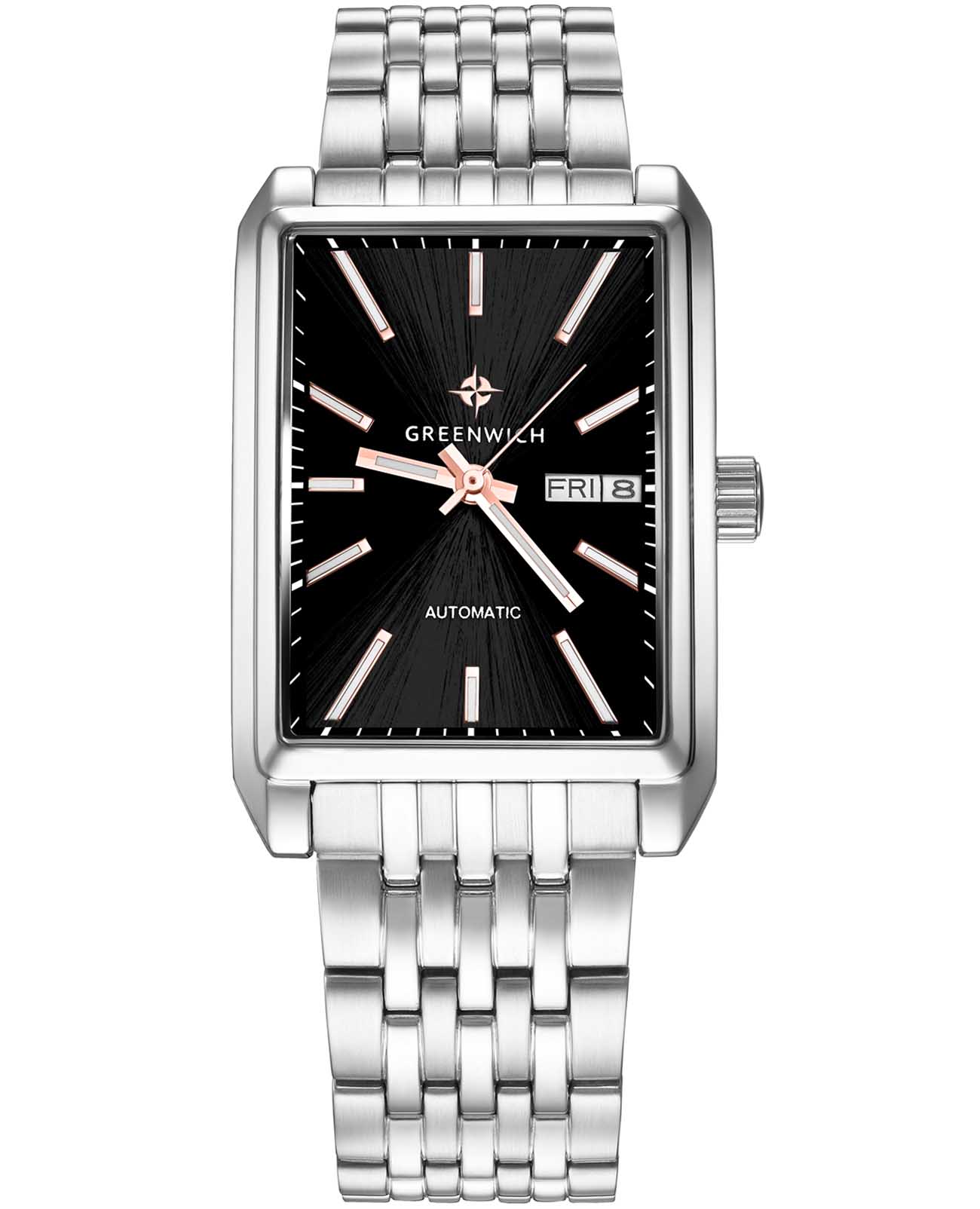 Часы Greenwich GW 564.10.15 из коллекции Caravel — элегантная мужская модель, сочетающая классический дизайн и современные технологии. Корпус размером 33 x 40 мм выполнен из гипоаллергенной нержавеющей стали. Минеральное стеклоМинеральное стеклоМинеральное стекло представляет собой искусственно выращенный минерал кварца. Такое стекло отличается особой устойчивостью к повреждениям и царапинам. Уступает по некоторым качествам сапфировому стеклу. устойчивое к мелким механическим повреждениям. Люминесцентное покрытиеЛюминесцентное покрытиеПозволяет считывать показания времени в темноте. Производители наносят на стрелки, часовые индексы, безель или поверхность циферблата светонакопительный состав, дающий холодное свечение. стрелок и меток позволит следить за временем даже в полной темноте. Водозащита до 5 ATM (50 метров) защищает от брызг и дождя, а также подходит для кратковременного погружения в воду. Браслет из нержавеющей стали с раскладной застёжкойРаскладная застёжкаТакой тип застёжки используется только на браслетах из металла. Она никогда не раскрывается полностью, происходит разделение на 2 и более частей. Раскладывающая застёжка снизит вероятность потери часов к минимуму. обеспечивает надёжную фиксацию и комфортное ношение. За движение стрелок, дисков даты и дня недели на черном циферблате отвечает механизм с функцией автоподзавода. Эта модель универсальна и подходит как для деловых встреч, так и для повседневного ношения, подчёркивая стиль и уверенность своего владельца.