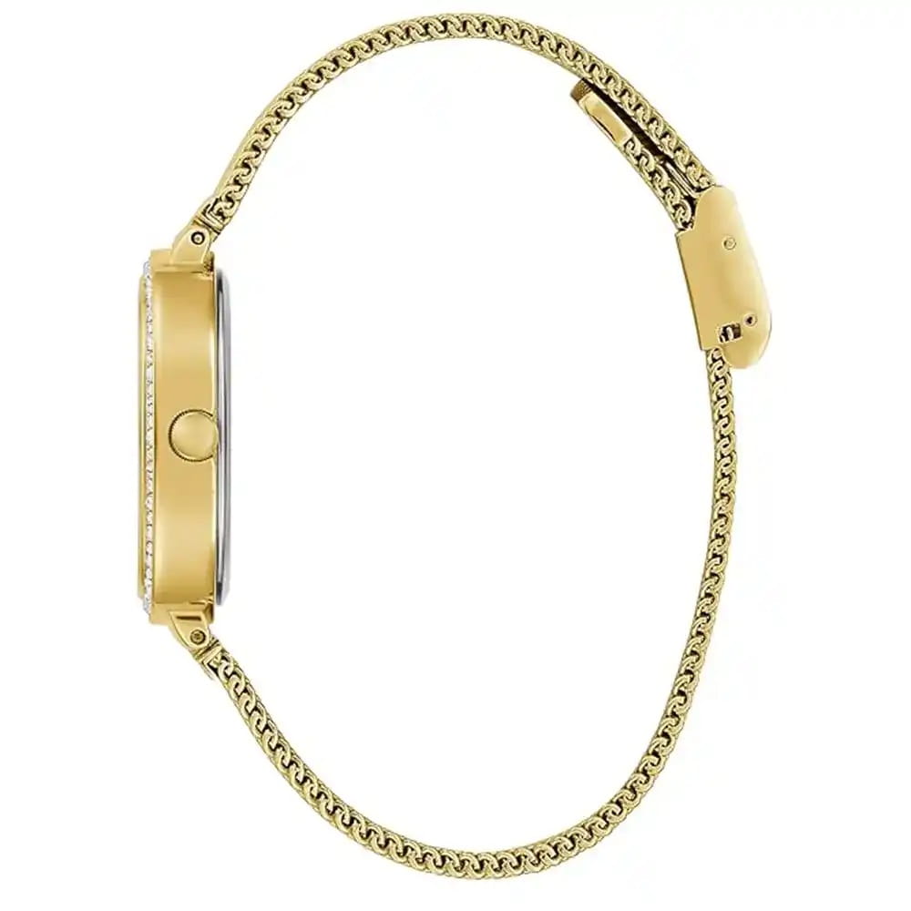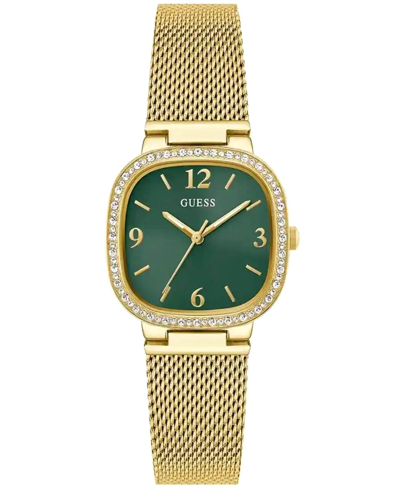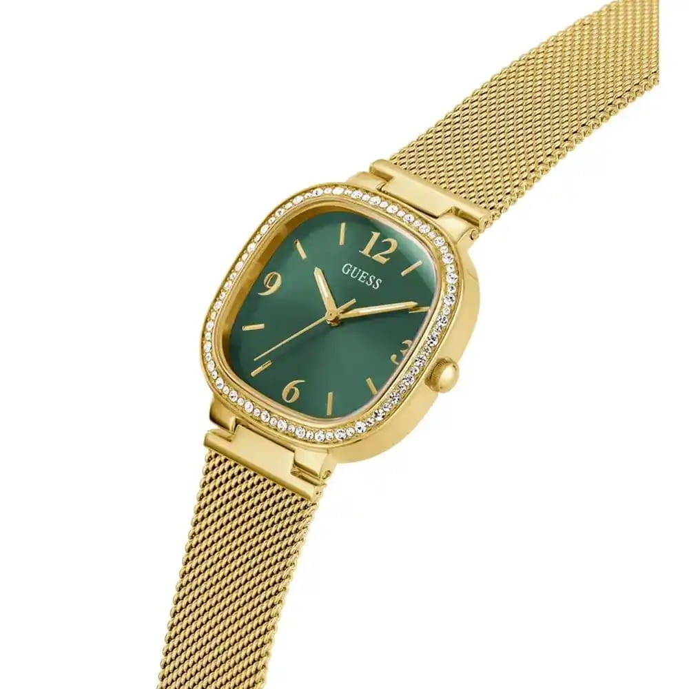 Часы Guess Trend GW0354L5 — это изысканный аксессуар, который добавит вашему современному образу нотку гламура и элегантности. Часы оснащены надежным кварцевым механизмом, который обеспечивает точность и долговечность. Стальной корпус с золотистым IP-покрытиемIP-покрытиеМетод ионного напыления. Демонстрирует повышенную устойчивость к истиранию, окислению и химическим веществам. Под воздействием высокого давления и температуры около 1500°C молекулы металла надёжно соединяются с частицами корпуса часов. и полированной поверхностью диаметром 32 мм придает часам стильный и современный вид. Зеленый циферблат с метками в виде штрихов и арабских цифр, создает утонченное и изысканное впечатление. Люминесцентное покрытиеЛюминесцентное покрытиеПозволяет считывать показания времени в темноте. Производители наносят на стрелки, часовые индексы, безель или поверхность циферблата светонакопительный состав, дающий холодное свечение. на стрелках обеспечивает отличную видимость в темноте. Неподвижный безельБезельВнешний ободок, закрепляющий стекло. В спортивных часах так называется поворотное кольцо с делениями на циферблате, выполняет роль таймера – замеряет отрезки времени на шкале. Неподвижный безель – элемент декора. Однонаправленно вращающийся безель на дайверских часах позволяет фиксировать моменты погружения и выныривания на поверхность. украшен кристаллами. Часы оснащены рифленой заводной головкой для удобного управления. Стальной браслет миланского плетения с золотистым IP-покрытиемIP-покрытиеМетод ионного напыления. Демонстрирует повышенную устойчивость к истиранию, окислению и химическим веществам. Под воздействием высокого давления и температуры около 1500°C молекулы металла надёжно соединяются с частицами корпуса часов. и раскладным замкомРаскладной замокДанный вариант застежки используется только на часах с металлическим браслетом. Отличительная особенность такого крепления в том, что длина браслета становится универсальной и вы можете самостоятельно отрегулировать нужный вам размер – застежка просто двигается по браслету часов. обеспечивает комфортное ношение и надежную фиксацию на запястье. Водозащита 30WR позволяет часам выдерживать случайные брызги, а минеральное стеклоМинеральное стеклоМинеральное стекло представляет собой искусственно выращенный минерал кварца. Такое стекло отличается особой устойчивостью к повреждениям и царапинам. Уступает по некоторым качествам сапфировому стеклу. защищает циферблат от царапин. Эта модель станет идеальным аксессуаром для ежедневного использования и особых мероприятий, подчеркивая вашу индивидуальность и стиль.