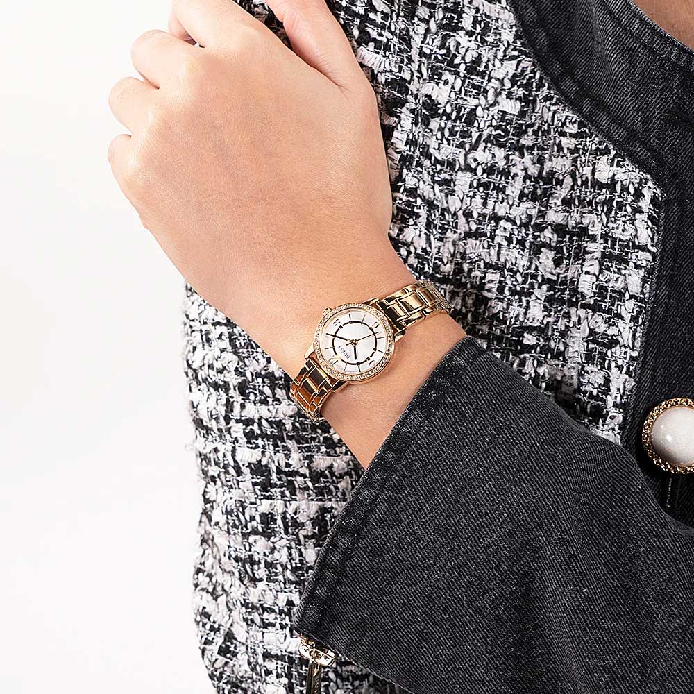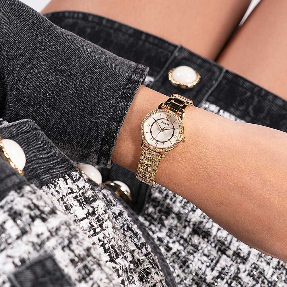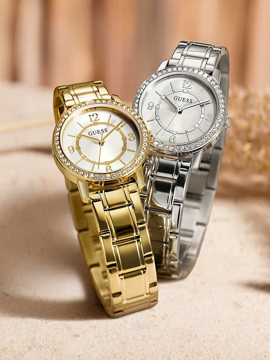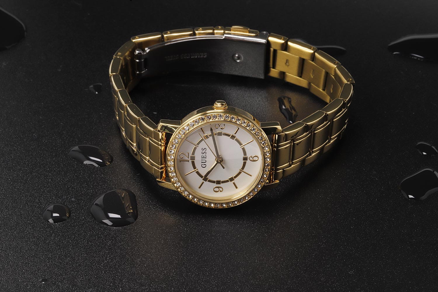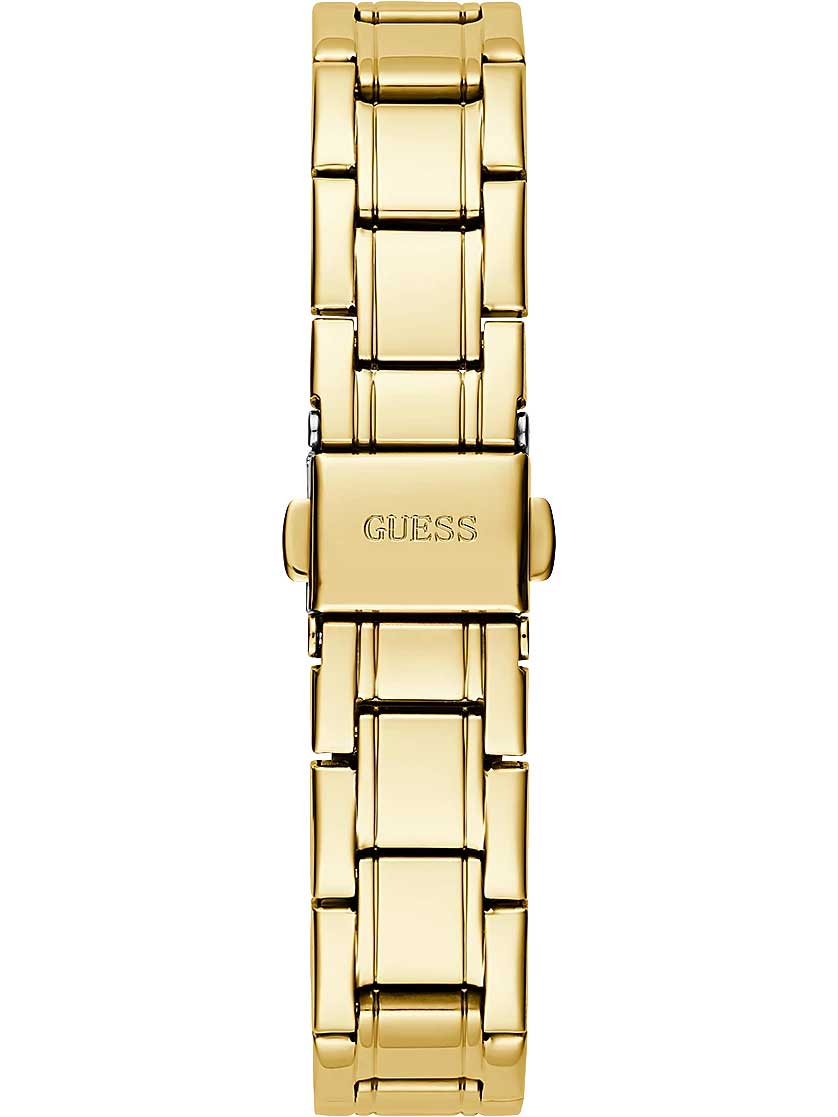 Женские наручные часы Guess Dress Steel GW0468L2 с минеральным стекломМинеральное стеклоМинеральное стекло представляет собой искусственно выращенный минерал кварца. Такое стекло отличается особой устойчивостью к повреждениям и царапинам. Уступает по некоторым качествам сапфировому стеклу., кварцевый механизм с высокой точностью. Класс водозащиты: 30 метров, позволит защитить корпус от случайных брызг или капель дождя. Корпус часов изготовлен из стали с IP-покрытиемIP-покрытиеМетод ионного напыления. Демонстрирует повышенную устойчивость к истиранию, окислению и химическим веществам. Под воздействием высокого давления и температуры около 1500°C молекулы металла надёжно соединяются с частицами корпуса часов.. Браслет с раскладной застёжкойРаскладная застёжкаТакой тип застёжки используется только на браслетах из металла. Она никогда не раскрывается полностью, происходит разделение на 2 и более частей. Раскладывающая застёжка снизит вероятность потери часов к минимуму..