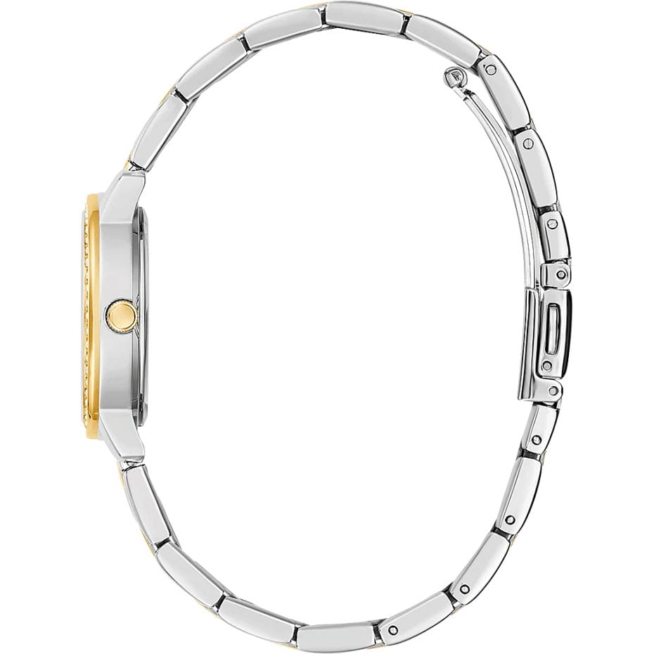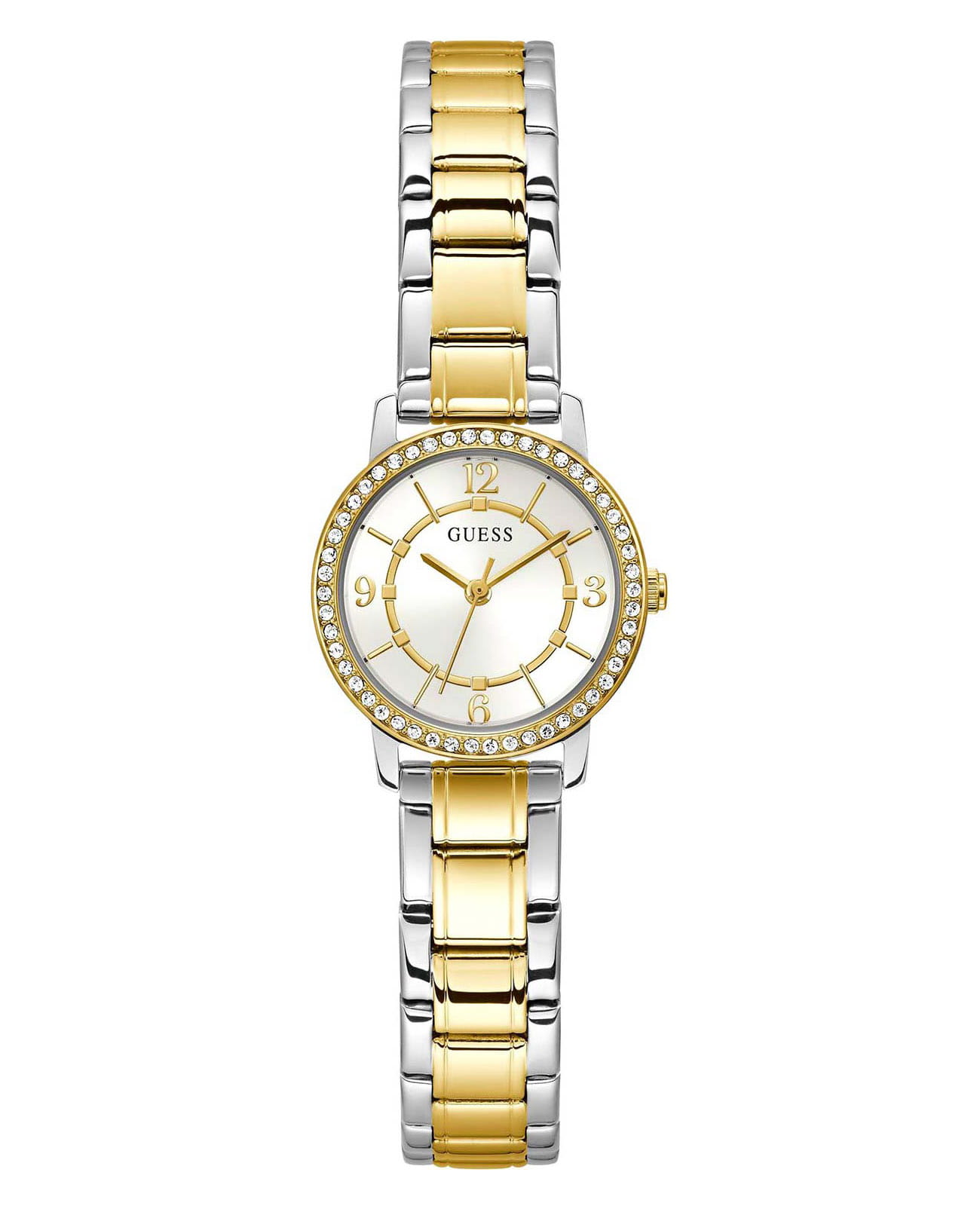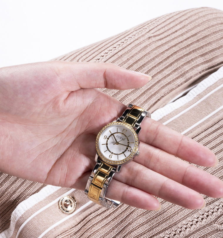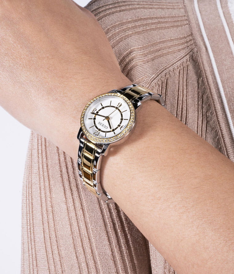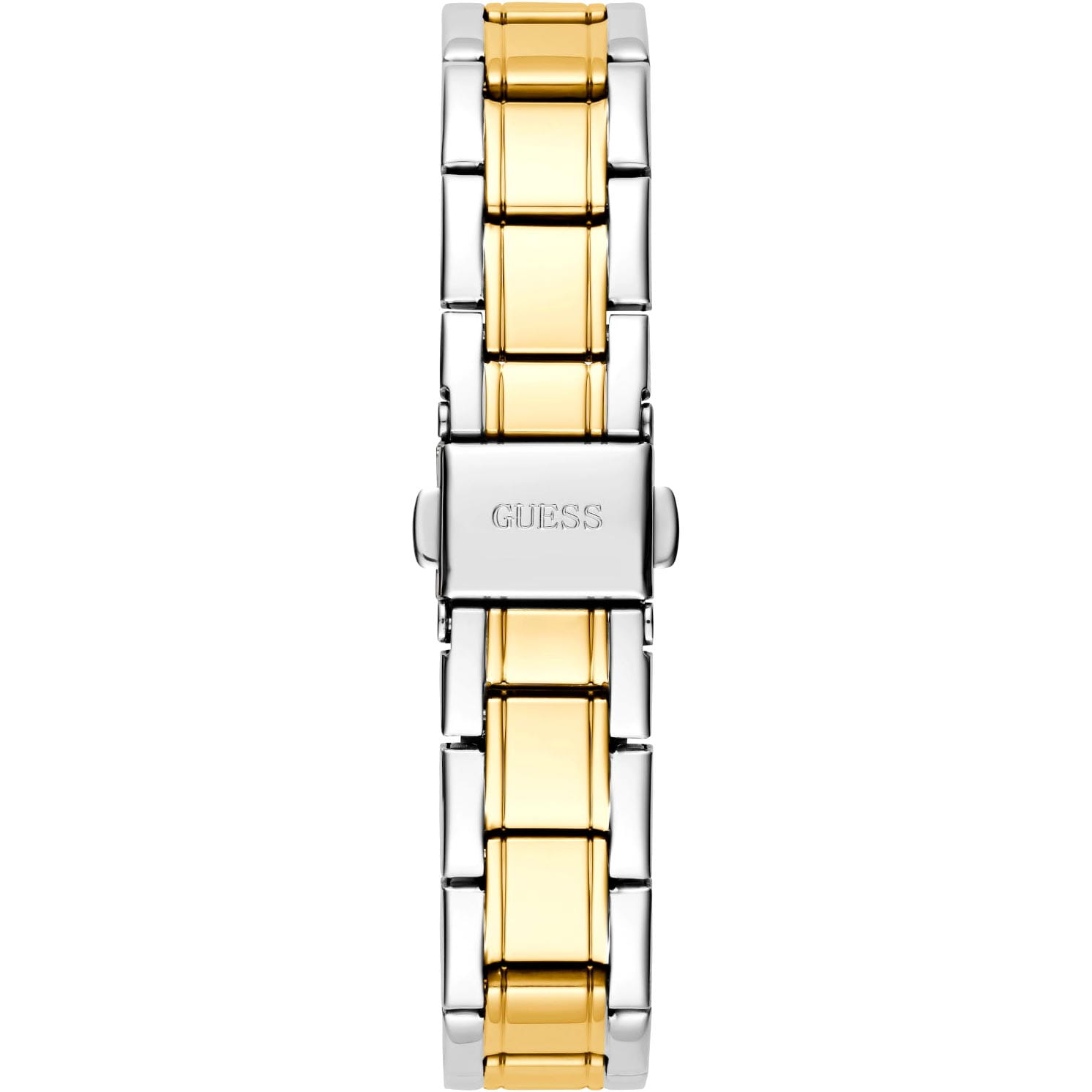 Женские наручные часы Guess Dress Steel GW0468L4 с минеральным стекломМинеральное стеклоМинеральное стекло представляет собой искусственно выращенный минерал кварца. Такое стекло отличается особой устойчивостью к повреждениям и царапинам. Уступает по некоторым качествам сапфировому стеклу., кварцевый механизм с высокой точностью. Класс водозащиты: 30 метров, позволит защитить корпус от случайных брызг или капель дождя. Корпус часов изготовлен из стали с частичным IP-покрытиемIP-покрытиеМетод ионного напыления. Демонстрирует повышенную устойчивость к истиранию, окислению и химическим веществам. Под воздействием высокого давления и температуры около 1500°C молекулы металла надёжно соединяются с частицами корпуса часов.. Браслет с раскладной застёжкойРаскладная застёжкаТакой тип застёжки используется только на браслетах из металла. Она никогда не раскрывается полностью, происходит разделение на 2 и более частей. Раскладывающая застёжка снизит вероятность потери часов к минимуму..
