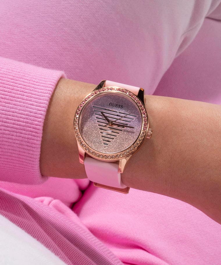 Женские наручные часы с минеральным стекломМинеральное стеклоМинеральное стекло представляет собой искусственно выращенный минерал кварца. Такое стекло отличается особой устойчивостью к повреждениям и царапинам. Уступает по некоторым качествам сапфировому стеклу. Guess Lady Idol GW0530L4, кварцевый механизм с высокой точностью. Класс водозащиты: 30 метров, позволит защитить корпус от случайных брызг или капель дождя. Корпус часов изготовлен из стали с IP-покрытиемIP-покрытиеМетод ионного напыления. Демонстрирует повышенную устойчивость к истиранию, окислению и химическим веществам. Под воздействием высокого давления и температуры около 1500°C молекулы металла надёжно соединяются с частицами корпуса часов.. Силиконовый ремешок на стандартной застёжке. Радужный циферблат. Рифленая заводная головка.
