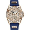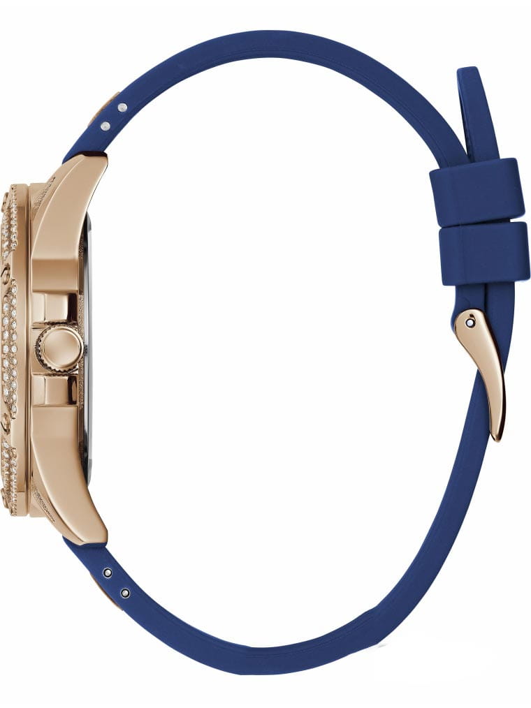 Женские наручные часы-скелетоны с минеральным стекломМинеральное стеклоМинеральное стекло представляет собой искусственно выращенный минерал кварца. Такое стекло отличается особой устойчивостью к повреждениям и царапинам. Уступает по некоторым качествам сапфировому стеклу. Guess Queen GW0536L5, кварцевый механизм с высокой точностью. Класс водозащиты: 30 метров, позволит защитить корпус от случайных брызг или капель дождя. Корпус часов изготовлен из стали с IP-покрытиемIP-покрытиеМетод ионного напыления. Демонстрирует повышенную устойчивость к истиранию, окислению и химическим веществам. Под воздействием высокого давления и температуры около 1500°C молекулы металла надёжно соединяются с частицами корпуса часов.. Силиконовый ремешок на стандартной застёжке. 24-х часовой формат времени, дата и день недели вынесены на отдельные циферблаты. Метки в виде штрихов. Рифленая заводная головка с защитой. Циферблат и ремешок украшены кристаллами.