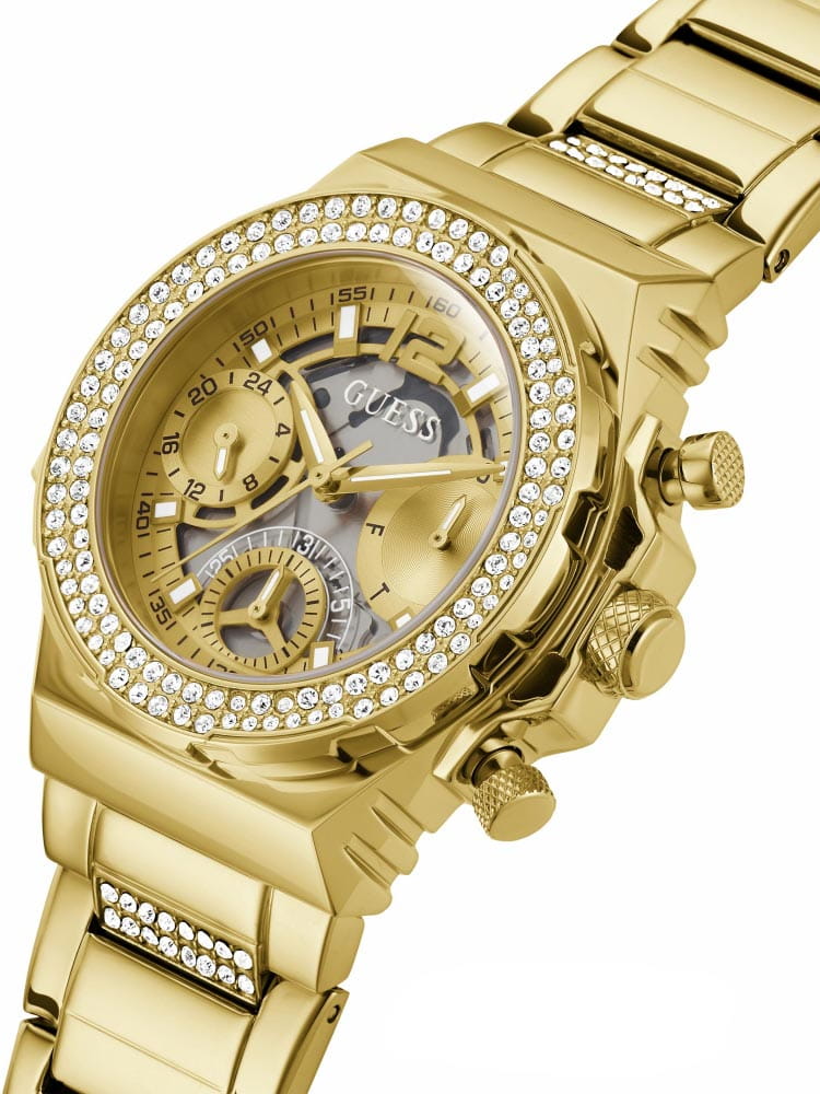 Женские наручные часы Guess Sport Steel GW0552L2 с минеральным стекломМинеральное стеклоМинеральное стекло представляет собой искусственно выращенный минерал кварца. Такое стекло отличается особой устойчивостью к повреждениям и царапинам. Уступает по некоторым качествам сапфировому стеклу., кварцевый механизм с высокой точностью. 24-х часовой формат времени, число и день недели отображаются на отдельных циферблатах. Стрелки и метки с люминесцентным покрытиемЛюминесцентное покрытиеПозволяет считывать показания времени в темноте. Производители наносят на стрелки, часовые индексы, безель или поверхность циферблата светонакопительный состав, дающий холодное свечение.. Класс водозащиты: 50 метров, позволит защитить корпус от случайных брызг или капель дождя. Корпус часов и браслет изготовлены из стали с IP-покрытиемIP-покрытиеМетод ионного напыления. Демонстрирует повышенную устойчивость к истиранию, окислению и химическим веществам. Под воздействием высокого давления и температуры около 1500°C молекулы металла надёжно соединяются с частицами корпуса часов.. БезельБезельВнешний ободок, закрепляющий стекло. В спортивных часах так называется поворотное кольцо с делениями на циферблате, выполняет роль таймера – замеряет отрезки времени на шкале. Неподвижный безель – элемент декора. Однонаправленно вращающийся безель на дайверских часах позволяет фиксировать моменты погружения и выныривания на поверхность. инкрустирован кристаллами. Браслет с раскладной застёжкойРаскладная застёжкаТакой тип застёжки используется только на браслетах из металла. Она никогда не раскрывается полностью, происходит разделение на 2 и более частей. Раскладывающая застёжка снизит вероятность потери часов к минимуму..