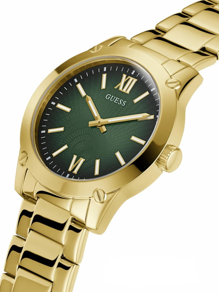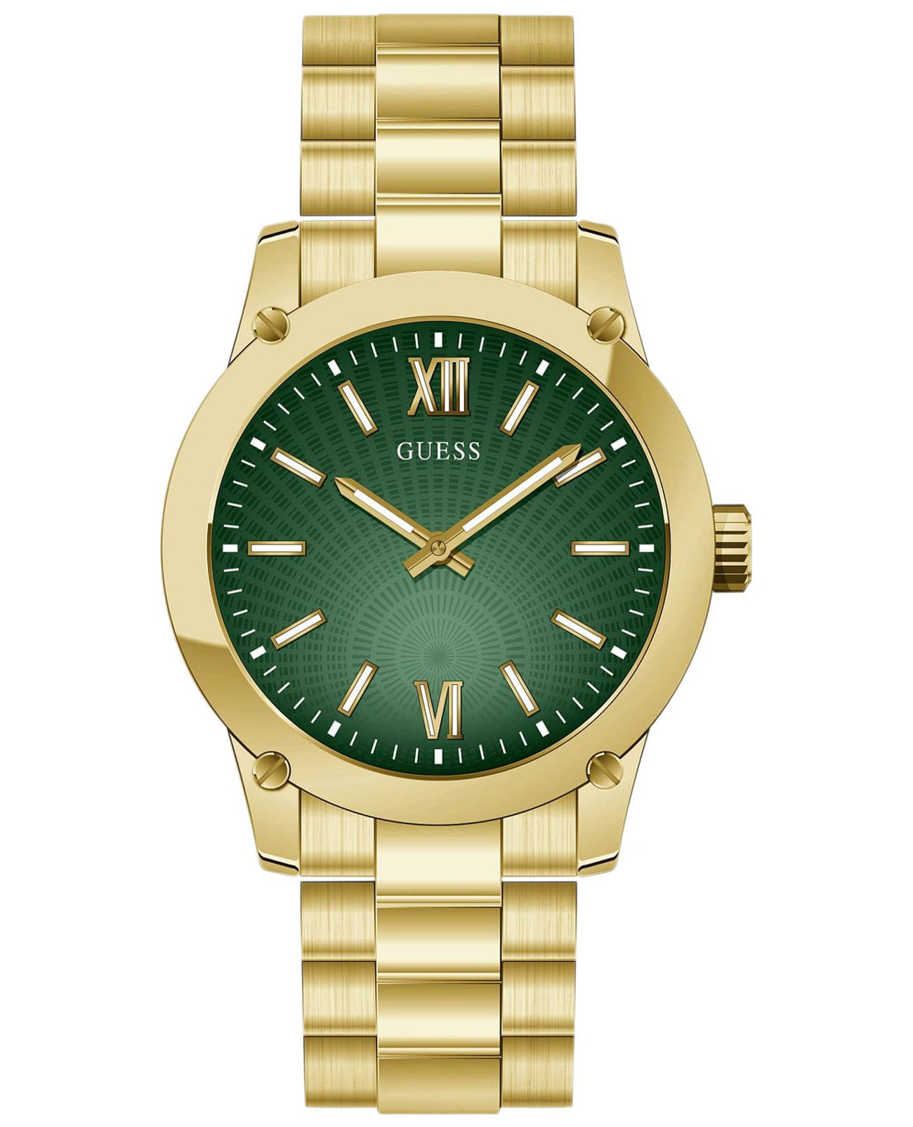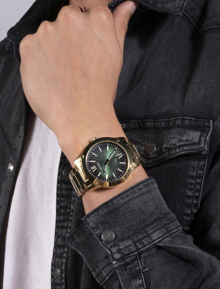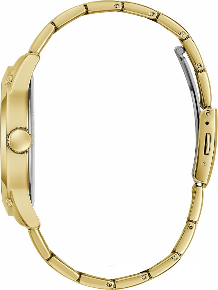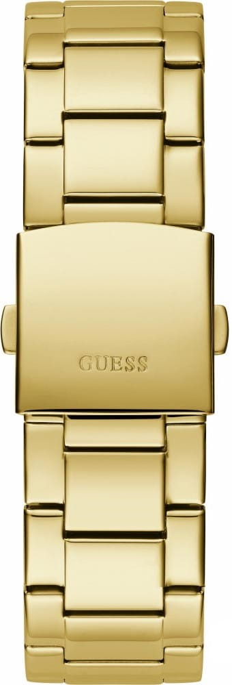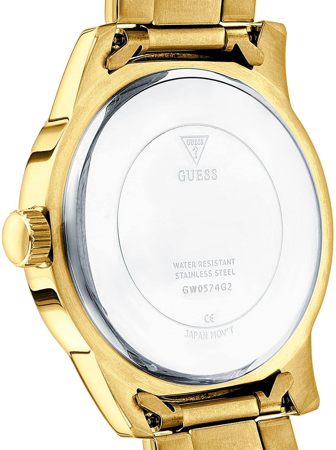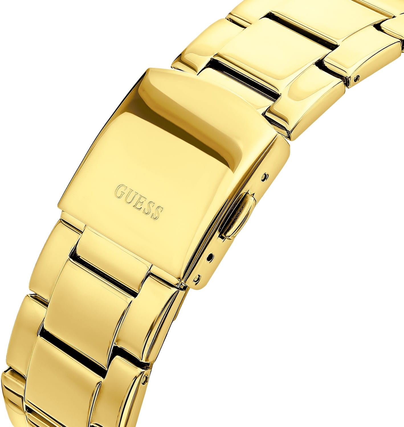 Мужские наручные часы Guess Crescent GW0574G2 с минеральным стекломМинеральное стеклоМинеральное стекло представляет собой искусственно выращенный минерал кварца. Такое стекло отличается особой устойчивостью к повреждениям и царапинам. Уступает по некоторым качествам сапфировому стеклу., кварцевый механизм с высокой точностью. Класс водозащиты: 50 метров, позволит защитить корпус от случайных брызг или капель дождя. Корпус часов изготовлен из стали с PVD-покрытиемPVDУльтратонкое покрытие наносится в технике вакуумного напыления, сочетает в себе нитрид титана особой прочности со слоем золота или оксида хрома. Несёт в себе декоративную или защитную функцию.. Стальной браслет на раскладной застёжкеРаскладная застёжкаТакой тип застёжки используется только на браслетах из металла. Она никогда не раскрывается полностью, происходит разделение на 2 и более частей. Раскладывающая застёжка снизит вероятность потери часов к минимуму. с PVD-покрытиемPVDУльтратонкое покрытие наносится в технике вакуумного напыления, сочетает в себе нитрид титана особой прочности со слоем золота или оксида хрома. Несёт в себе декоративную или защитную функцию.. Гильошированный циферблат. Метки в виде штрихов и римских цифр. Рифленая заводная головка. Стрелки с люминесцентным покрытиемЛюминесцентное покрытиеПозволяет считывать показания времени в темноте. Производители наносят на стрелки, часовые индексы, безель или поверхность циферблата светонакопительный состав, дающий холодное свечение..