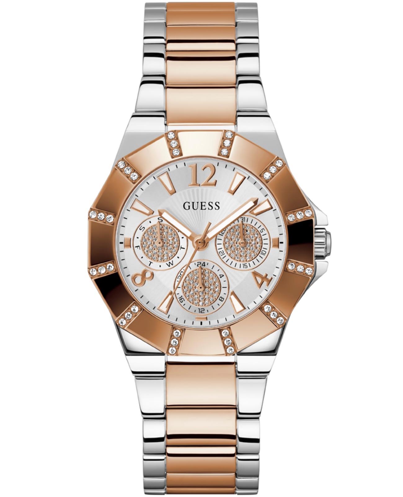 Женские наручные часы с минеральным стекломМинеральное стеклоМинеральное стекло представляет собой искусственно выращенный минерал кварца. Такое стекло отличается особой устойчивостью к повреждениям и царапинам. Уступает по некоторым качествам сапфировому стеклу. Guess Sport lady GW0616L3, кварцевый механизм с высокой точностью. Класс водозащиты: 30 метров, позволит защитить корпус от случайных брызг или капель дождя. Корпус часов изготовлен из стали. Стальной браслет на раскладной застёжкеРаскладная застёжкаТакой тип застёжки используется только на браслетах из металла. Она никогда не раскрывается полностью, происходит разделение на 2 и более частей. Раскладывающая застёжка снизит вероятность потери часов к минимуму. с IP-покрытиемIP-покрытиеМетод ионного напыления. Демонстрирует повышенную устойчивость к истиранию, окислению и химическим веществам. Под воздействием высокого давления и температуры около 1500°C молекулы металла надёжно соединяются с частицами корпуса часов..БезельБезельВнешний ободок, закрепляющий стекло. В спортивных часах так называется поворотное кольцо с делениями на циферблате, выполняет роль таймера – замеряет отрезки времени на шкале. Неподвижный безель – элемент декора. Однонаправленно вращающийся безель на дайверских часах позволяет фиксировать моменты погружения и выныривания на поверхность. с IP-покрытиемIP-покрытиеМетод ионного напыления. Демонстрирует повышенную устойчивость к истиранию, окислению и химическим веществам. Под воздействием высокого давления и температуры около 1500°C молекулы металла надёжно соединяются с частицами корпуса часов. инкрустирован кристаллами. Стрелки и метки с люминесцентным покрытиемЛюминесцентное покрытиеПозволяет считывать показания времени в темноте. Производители наносят на стрелки, часовые индексы, безель или поверхность циферблата светонакопительный состав, дающий холодное свечение..