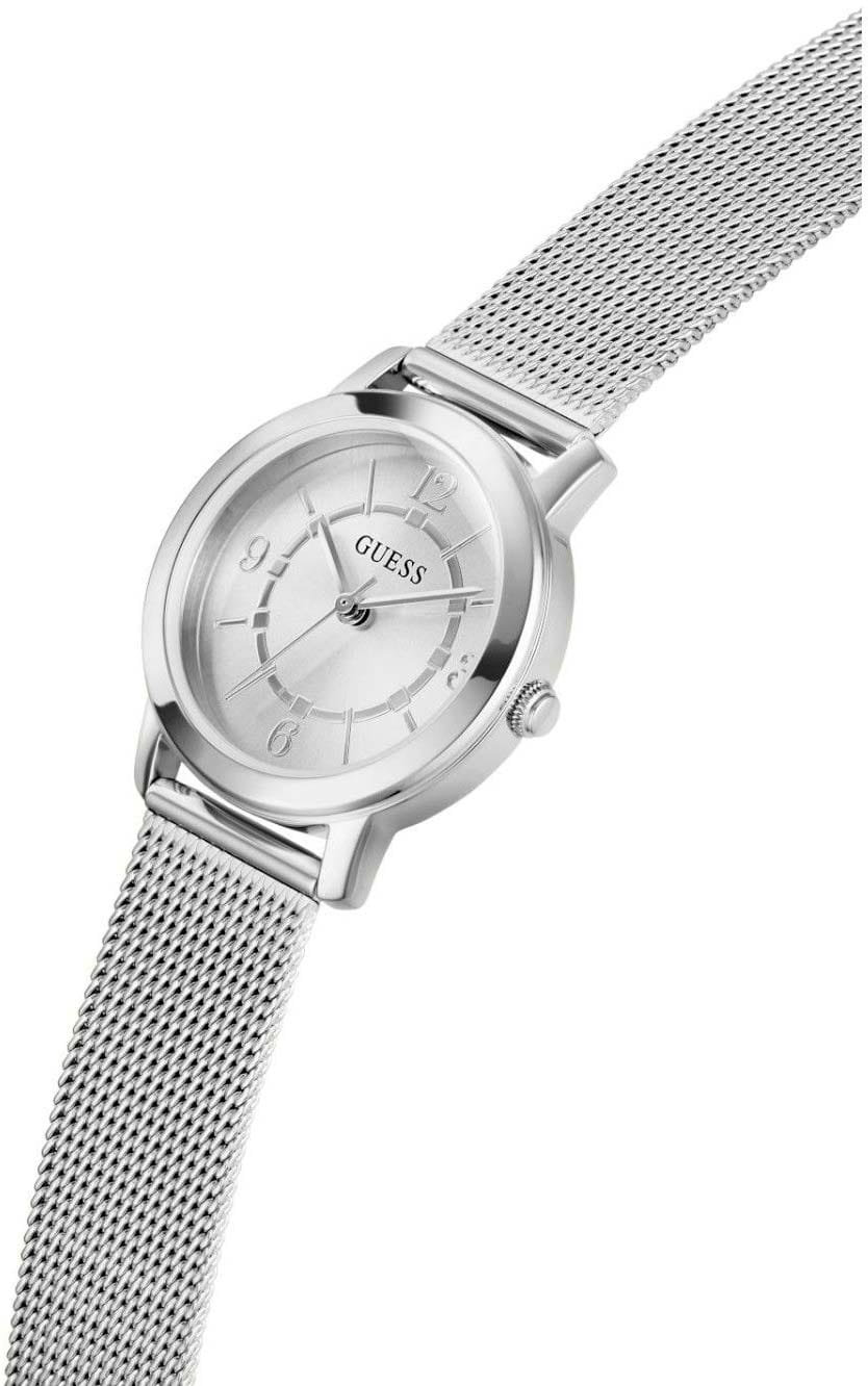 Женские наручные часы Guess Melody GW0666L1 с минеральным стекломМинеральное стеклоМинеральное стекло представляет собой искусственно выращенный минерал кварца. Такое стекло отличается особой устойчивостью к повреждениям и царапинам. Уступает по некоторым качествам сапфировому стеклу., кварцевый механизм с высокой точностью. Класс водозащиты: 30 метров, позволит защитить корпус от случайных брызг или капель дождя. Корпус часов изготовлен из стали. Браслет миланского плетения на раскладной застёжкеРаскладная застёжкаТакой тип застёжки используется только на браслетах из металла. Она никогда не раскрывается полностью, происходит разделение на 2 и более частей. Раскладывающая застёжка снизит вероятность потери часов к минимуму.. Метки в виде штрихов и арабских цифр. Рифленая заводная головка.