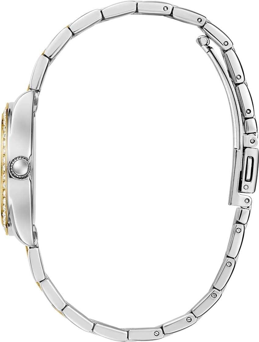 Эти элегантные часы Guess GW0841L2 станут идеальным дополнением для тех, кто стремится подчеркнуть свой стиль и уверенность. Оснащенные надежным кварцевым механизмом, они обеспечивают точность и долговечность. Круглый стальной корпус с полированной поверхностью придает часам современный и изысканный вид. БезельБезельВнешний ободок, закрепляющий стекло. В спортивных часах так называется поворотное кольцо с делениями на циферблате, выполняет роль таймера – замеряет отрезки времени на шкале. Неподвижный безель – элемент декора. Однонаправленно вращающийся безель на дайверских часах позволяет фиксировать моменты погружения и выныривания на поверхность. с золотистым IP-покрытиемIP-покрытиеМетод ионного напыления. Демонстрирует повышенную устойчивость к истиранию, окислению и химическим веществам. Под воздействием высокого давления и температуры около 1500°C молекулы металла надёжно соединяются с частицами корпуса часов. украшен кристаллами, добавляющими дополнительный блеск и роскошь. Золотистый циферблат, выполненный по технологии Sunray, притягивает взгляды своим изысканным сиянием. Метки на циферблате представлены в виде штрихов и римских цифр, что подчеркивает классический стиль аксессуара. Люминесцентное покрытиеЛюминесцентное покрытиеПозволяет считывать показания времени в темноте. Производители наносят на стрелки, часовые индексы, безель или поверхность циферблата светонакопительный состав, дающий холодное свечение. на стрелках обеспечивает отличную видимость в темноте. Рифленая заводная головка обеспечивает удобство в настройке времени. Стальной браслет с частичным золотистым IP-покрытиемIP-покрытиеМетод ионного напыления. Демонстрирует повышенную устойчивость к истиранию, окислению и химическим веществам. Под воздействием высокого давления и температуры около 1500°C молекулы металла надёжно соединяются с частицами корпуса часов. и с раскладной застежкойРаскладная застёжкаТакой тип застёжки используется только на браслетах из металла. Она никогда не раскрывается полностью, происходит разделение на 2 и более частей. Раскладывающая застёжка снизит вероятность потери часов к минимуму. гарантирует комфортное ношение и надежную фиксацию на запястье. Часы обладают водозащитой 30WR, что делает их устойчивыми к случайным брызгам. Минеральное стеклоМинеральное стеклоМинеральное стекло представляет собой искусственно выращенный минерал кварца. Такое стекло отличается особой устойчивостью к повреждениям и царапинам. Уступает по некоторым качествам сапфировому стеклу. защищает циферблат от царапин и других повреждений.