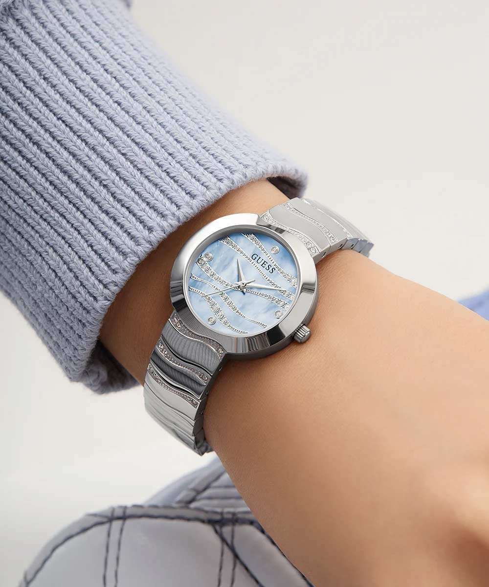 Часы Guess GW0871L1 — это стильный и утонченный аксессуар, который прекрасно дополнит образ современной женщины. Они оснащены надежным кварцевым механизмом. Корпус выполнен из стали и украшен кристаллами, что придаёт часам роскошный и элегантный вид. Перламутровый голубой циферблат с волнообразными линиями создаёт эффект глубины и изысканности, а метки в виде точек добавляют утончённости. Часы имеют рифленую заводную головку для удобной настройки времени. Стальной браслет с волнообразными звеньями и раскладной застежкойРаскладная застёжкаТакой тип застёжки используется только на браслетах из металла. Она никогда не раскрывается полностью, происходит разделение на 2 и более частей. Раскладывающая застёжка снизит вероятность потери часов к минимуму. обеспечивает комфортное и надежное ношение, а также украшен кристаллами, что добавляет блеска и привлекательности. Водозащита 30WR гарантирует защиту от случайных брызг воды. Минеральное стеклоМинеральное стеклоМинеральное стекло представляет собой искусственно выращенный минерал кварца. Такое стекло отличается особой устойчивостью к повреждениям и царапинам. Уступает по некоторым качествам сапфировому стеклу. защищает циферблат от царапин и повреждений.
