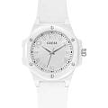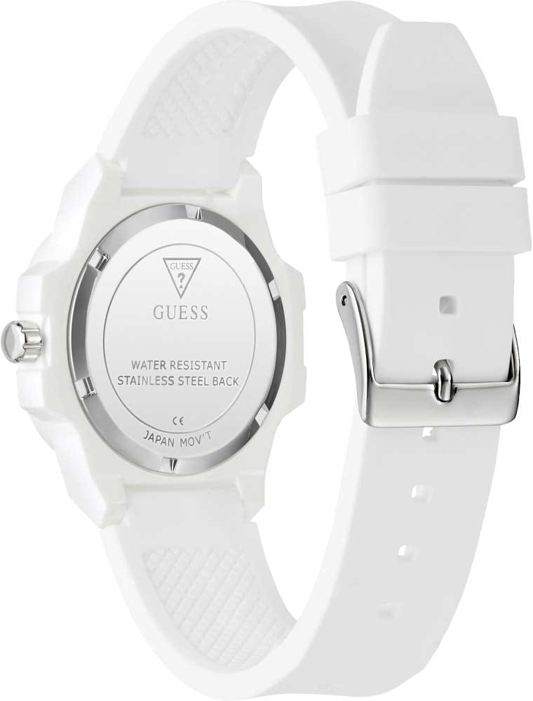 Элегантные женские наручные часы Guess GW0880L3 сочетают в себе стиль и функциональность. Эти часы оснащены точным кварцевым механизмом, что гарантирует надежность и долговечность. Корпус часов выполнен из прочной нержавеющей стали с IP-покрытиемIP-покрытиеМетод ионного напыления. Демонстрирует повышенную устойчивость к истиранию, окислению и химическим веществам. Под воздействием высокого давления и температуры около 1500°C молекулы металла надёжно соединяются с частицами корпуса часов. белого цвета, диаметром 34 мм, придающий им роскошный вид. Белый циферблат добавляет изделию утонченности и особого шарма. Часы оснащены силиконовым ремешком на стандартной застёжке, которая обеспечивает комфортное прилегание к запястью и надежную фиксацию.  Люминесцентное покрытиеЛюминесцентное покрытиеПозволяет считывать показания времени в темноте. Производители наносят на стрелки, часовые индексы, безель или поверхность циферблата светонакопительный состав, дающий холодное свечение. на стрелках обеспечивает отличную видимость в темноте. Минеральное стеклоМинеральное стеклоМинеральное стекло представляет собой искусственно выращенный минерал кварца. Такое стекло отличается особой устойчивостью к повреждениям и царапинам. Уступает по некоторым качествам сапфировому стеклу. защищает циферблат от царапин и повреждений, сохраняя его безупречный вид. Водозащита 50WR гарантирует защиту от случайных брызг и дождя, что делает эти часы практичным аксессуаром для повседневной жизни. Рифленая заводная головка с защитой. Guess – это не просто аксессуар, это заявление о вашем безупречном вкусе и стремлении к совершенству.