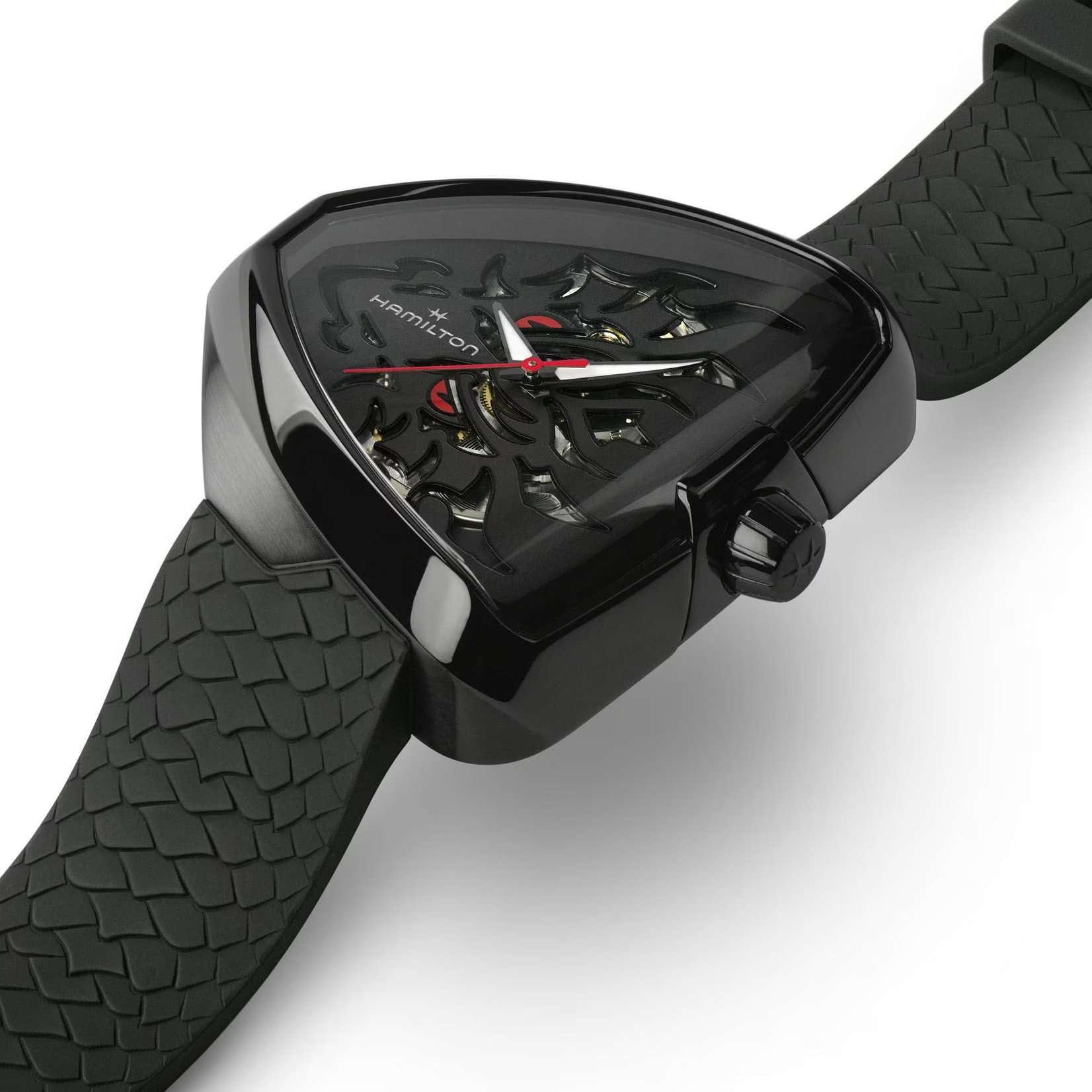Мужские швейцарские механические часы с автоподзаводом Hamilton Ventura Elvis80 Skeleton Auto H24535332. Механический механизм (автоматический калибр) с высокой точностью. Сапфировое стеклоСапфировое стеклоПрочный и надёжный материал из кристалла сапфира синтетического происхождения, характеризующийся особой твёрдостью и устойчивостью к царапинам и повреждениям. устойчивое к появлению царапин, обладающее высокой прозрачностью. Класс водозащиты: 50 метров, позволит защитить корпус от случайных брызг или капель дождя. Корпус часов изготовлен из нержавеющей стали с PVD-покрытиемPVDУльтратонкое покрытие наносится в технике вакуумного напыления, сочетает в себе нитрид титана особой прочности со слоем золота или оксида хрома. Несёт в себе декоративную или защитную функцию. черного цвета. Под циферблатом находится механизм H-10-S с 80-часовым запасом хода и спиралью баланса Nivachron™Nivachron™Специально разработанный инновационный сплав Nivachron™ повышает устойчивость часов к воздействию магнитных полей..