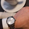 Серебристый циферблат с люминесцентными стрелкамиЛюминесцентное покрытиеПозволяет считывать показания времени в темноте. Производители наносят на стрелки, часовые индексы, безель или поверхность циферблата светонакопительный состав, дающий холодное свечение. и часовыми метками гарантирует отличную читаемость в любых условиях. Сапфировое стеклоСапфировое стеклоПрочный и надёжный материал из кристалла сапфира синтетического происхождения, характеризующийся особой твёрдостью и устойчивостью к царапинам и повреждениям. защищает дисплей от царапин, сохраняя его безупречный вид.
