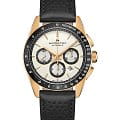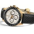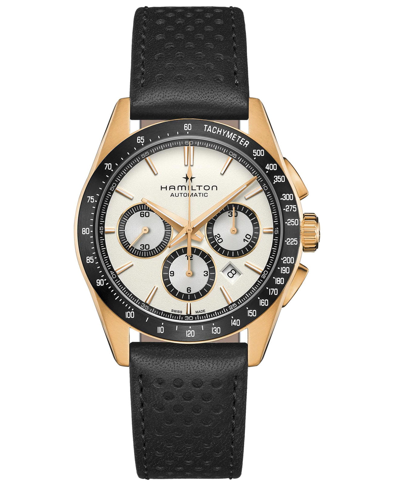 Модели из линии Jazzmaster Performer, привлекающие внимание ярким дизайном в стиле спортивный шик, сочетают в себе функциональность и эстетичность. Часы Jazzmaster Performer Automatic Chronograph оснащены автоматическим механизмом хронографаХронографФункция позволяет измерять отрезки времени с особой точностью: часы, минуты, секунды. Верным признаком хронографа является наличие на циферблате 3 дополнительных окошек-счётчиков. H-31 с 60-часовым запасом хода. Модель в корпусе из нержавеющей стали с PVD-покрытиемPVDУльтратонкое покрытие наносится в технике вакуумного напыления, сочетает в себе нитрид титана особой прочности со слоем золота или оксида хрома. Несёт в себе декоративную или защитную функцию. цвета розового золота диаметром 42 мм имеет изящный белый циферблат и сочетающийся с безелем БезельВнешний ободок, закрепляющий стекло. В спортивных часах так называется поворотное кольцо с делениями на циферблате, выполняет роль таймера – замеряет отрезки времени на шкале. Неподвижный безель – элемент декора. Однонаправленно вращающийся безель на дайверских часах позволяет фиксировать моменты погружения и выныривания на поверхность. перфорированный черный кожаный ремешок в гоночном стиле.