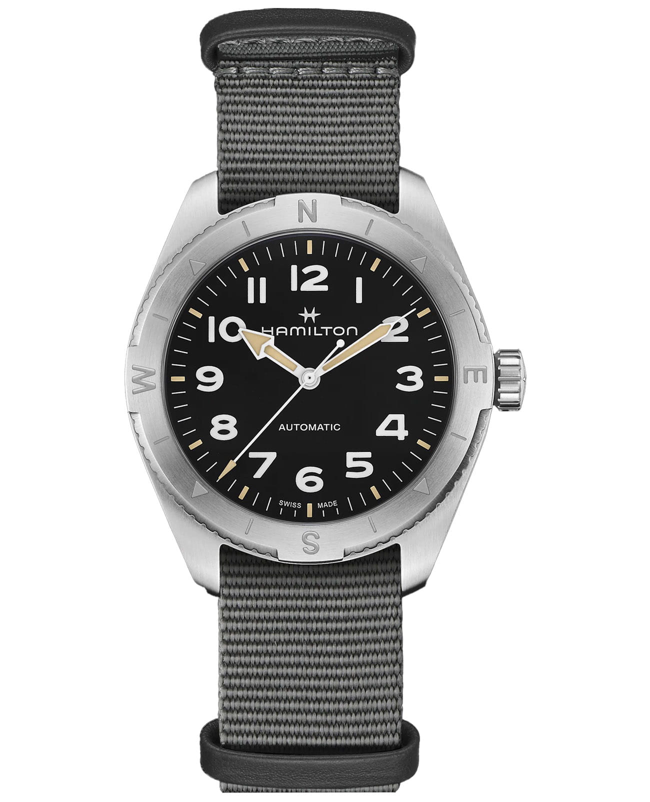 Мужские наручные часы Hamilton Khaki Field Expedition Auto H70315930 с автоматическим механизмом. Корпус часов изготовлен из нержавеющей стали. Сапфировое стеклоСапфировое стеклоПрочный и надёжный материал из кристалла сапфира синтетического происхождения, характеризующийся особой твёрдостью и устойчивостью к царапинам и повреждениям. с антибликовым покрытием. Стрелки и метки с люминесцентным покрытиемЛюминесцентное покрытиеПозволяет считывать показания времени в темноте. Производители наносят на стрелки, часовые индексы, безель или поверхность циферблата светонакопительный состав, дающий холодное свечение.. Уровень влагозащиты: 100 метров, позволит плавать, нырять и заниматься другими водными видами спорта. Невероятно прочные часы дополнены завинчивающейся заводной головкой и черным циферблатом с пескоструйной обработкой. Текстильный ремешок NATOРемешок NATOРемешок NATO — это прочный, универсальный и сменный часовой ремешок, изначально созданный для военных. Он изготовлен из нейлона или другого прочного материала и имеет уникальную конструкцию, которая позволяет часам оставаться на запястье даже в случае поломки одной из прикрепляющих точек. .