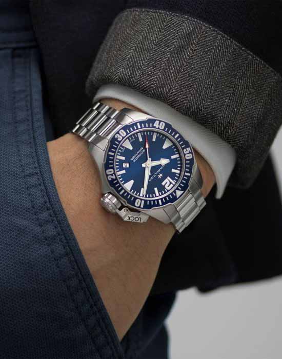 Автоматический швейцарский калибр H-10 сохраняет запас хода на 80 часов. Стрелки и метки имеют люминесцентную подсветкуЛюминесцентное покрытиеПозволяет считывать показания времени в темноте. Производители наносят на стрелки, часовые индексы, безель или поверхность циферблата светонакопительный состав, дающий холодное свечение.. Поддерживать водостойкость в 30 бар помогают закручивающаяся задняя крышка, завинчивающаяся головка. Сапфировое стекло дополнено антибликовым покрытиемАнтибликовое покрытиеСлой оксида металла в 0,13-0,3 микрон, благодаря которому стекло часов не бликует и не отражает свет. Антибликовое покрытие уменьшает отражение света в 10 раз, обеспечивая отличную читаемость показателей циферблата..