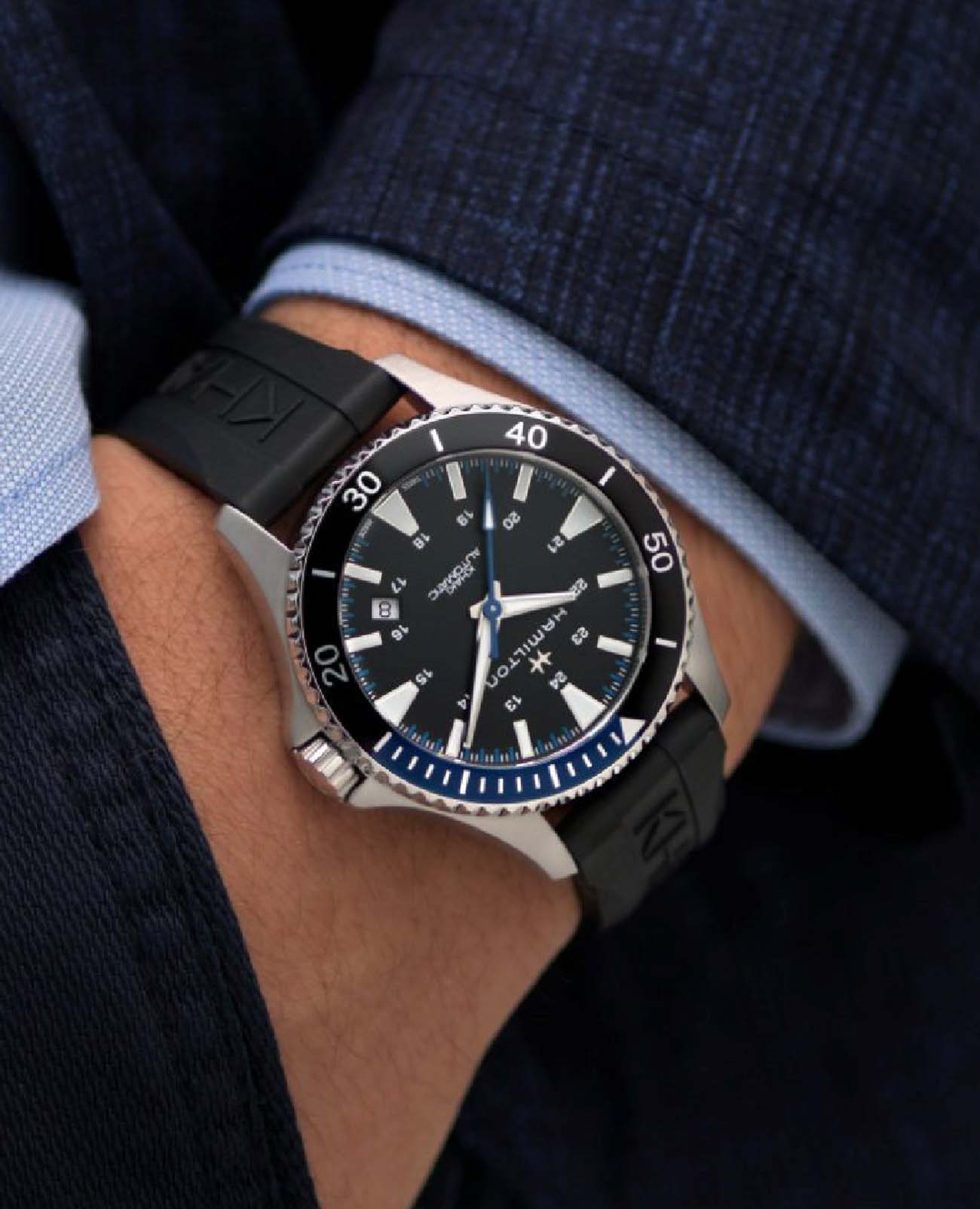 Мужские наручные часы Hamilton Khaki Navy Scuba Auto 40MM H82315331 с автоматическим механизмом Н-10. Корпус часов выполнен из нержавеющей стали. Сапфировое стеклоСапфировое стеклоПрочный и надёжный материал из кристалла сапфира синтетического происхождения, характеризующийся особой твёрдостью и устойчивостью к царапинам и повреждениям. с антибликовым покрытием. БезельБезельВнешний ободок, закрепляющий стекло. В спортивных часах так называется поворотное кольцо с делениями на циферблате, выполняет роль таймера – замеряет отрезки времени на шкале. Неподвижный безель – элемент декора. Однонаправленно вращающийся безель на дайверских часах позволяет фиксировать моменты погружения и выныривания на поверхность. с PVD-покрытиемPVDУльтратонкое покрытие наносится в технике вакуумного напыления, сочетает в себе нитрид титана особой прочности со слоем золота или оксида хрома. Несёт в себе декоративную или защитную функцию.. Практичный браслет из каучука на стандартной застёжке. Уровень влагозащиты: 100 метров, позволит плавать, нырять и заниматься другими водными видами спорта. Стрелки и метки с люминесцентным покрытиемЛюминесцентное покрытиеПозволяет считывать показания времени в темноте. Производители наносят на стрелки, часовые индексы, безель или поверхность циферблата светонакопительный состав, дающий холодное свечение.. Окошко даты находится в положении между 4 и 5 часов. 12 и 24-часовой формат времени.