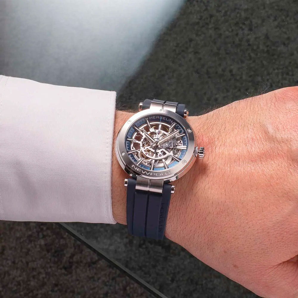 Мужские механические часы с автоподзаводом Herbelin Newport 1868SQ15CB – отражающий идеальное сочетание современного дизайна, надёжности и функциональности. Элегантный облик станет превосходным завершением образа, наделив его индивидуальным характером. Корпус из нержавеющей стали серебристого цвета, диаметром 42 мм, идеально сбалансирован и элегантен. Сапфировое стеклоСапфировое стеклоПрочный и надёжный материал из кристалла сапфира синтетического происхождения, характеризующийся особой твёрдостью и устойчивостью к царапинам и повреждениям. защищает циферблат от царапин и устойчивое к механическим повреждениям. БезельБезельВнешний ободок, закрепляющий стекло. В спортивных часах так называется поворотное кольцо с делениями на циферблате, выполняет роль таймера – замеряет отрезки времени на шкале. Неподвижный безель – элемент декора. Однонаправленно вращающийся безель на дайверских часах позволяет фиксировать моменты погружения и выныривания на поверхность. украшен винтами. Стрелки и метки с люминесцентным покрытиемЛюминесцентное покрытиеПозволяет считывать показания времени в темноте. Производители наносят на стрелки, часовые индексы, безель или поверхность циферблата светонакопительный состав, дающий холодное свечение.. Синий каучуковый ремешок на стандартной застёжке обеспечивает комфортное ношение. Прозрачная задняя крышка. Водозащита 100 метров позволит плавать, нырять и заниматься другими водными видами спорта. Эта модель – отличный выбор для тех, кто ищет сочетание стиля, качества и функциональности. Часы станут не только полезным аксессуаром, но и выразительным элементом вашего имиджа.