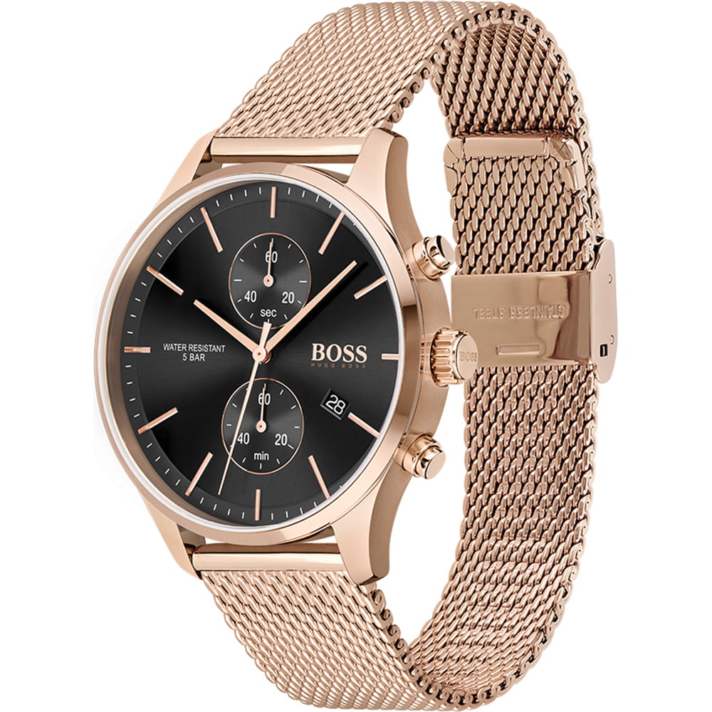 Мужские часы Hugo Boss Associate HB1513806 представлены в круглом 42-мм корпусе из нержавеющей стали 316L с золотистым PVD-покрытиемPVDУльтратонкое покрытие наносится в технике вакуумного напыления, сочетает в себе нитрид титана особой прочности со слоем золота или оксида хрома. Несёт в себе декоративную или защитную функцию.. Оснащены кварцевым механизмом с функциями хронографаХронографФункция позволяет измерять отрезки времени с особой точностью: часы, минуты, секунды. Верным признаком хронографа является наличие на циферблате 3 дополнительных окошек-счётчиков., секундомеромСекундомерСекундоме́р — прибор, способный измерять интервалы времени с точностью до долей секунды. и индикацией даты на позиции 4 часа. Циферблат с подсветкой стрелок защищен устойчивым к царапинам минеральным стекломМинеральное стеклоМинеральное стекло представляет собой искусственно выращенный минерал кварца. Такое стекло отличается особой устойчивостью к повреждениям и царапинам. Уступает по некоторым качествам сапфировому стеклу.. Стальной браслет дополнен раскладной застёжкойРаскладная застёжкаТакой тип застёжки используется только на браслетах из металла. Она никогда не раскрывается полностью, происходит разделение на 2 и более частей. Раскладывающая застёжка снизит вероятность потери часов к минимуму. с фиксатором для надежной посадки. Водонепроницаемость 50 метров (5 ATM) обеспечивает защиту от брызг и дождя.