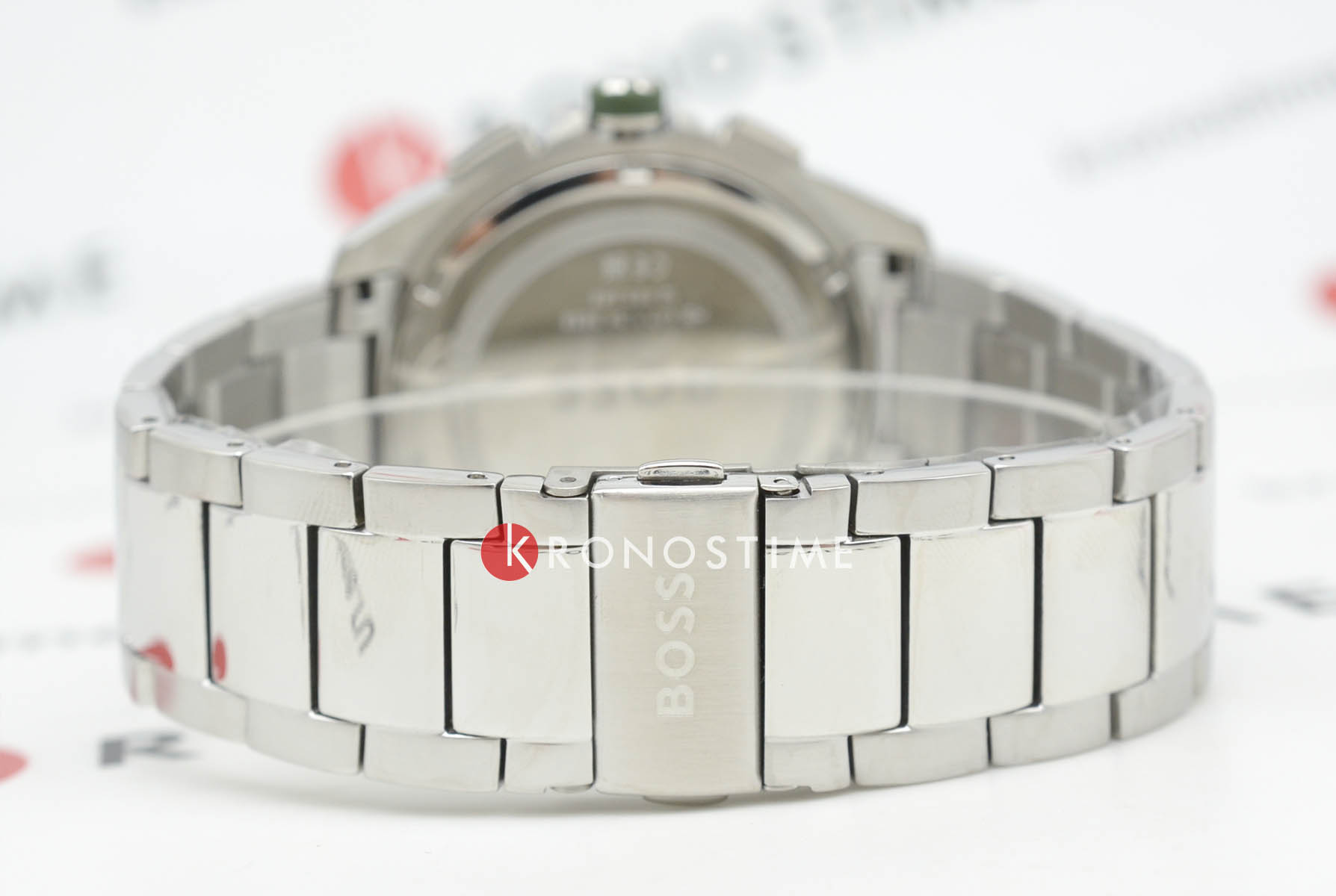 Мужские часы Hugo Boss Volane HB 1513951 представлены в круглом 44-мм корпусе из нержавеющей стали. Оснащены кварцевым механизмом с функциями хронографаХронографФункция позволяет измерять отрезки времени с особой точностью: часы, минуты, секунды. Верным признаком хронографа является наличие на циферблате 3 дополнительных окошек-счётчиков. и секундомеромСекундомерСекундоме́р — прибор, способный измерять интервалы времени с точностью до долей секунды.. Зеленый циферблат защищен устойчивым к царапинам минеральным стекломМинеральное стеклоМинеральное стекло представляет собой искусственно выращенный минерал кварца. Такое стекло отличается особой устойчивостью к повреждениям и царапинам. Уступает по некоторым качествам сапфировому стеклу.. Стальной браслет серебристого цвета дополнен раскладной застёжкойРаскладная застёжкаТакой тип застёжки используется только на браслетах из металла. Она никогда не раскрывается полностью, происходит разделение на 2 и более частей. Раскладывающая застёжка снизит вероятность потери часов к минимуму., а стрелки покрыты люминесцентным составомЛюминесцентное покрытиеПозволяет считывать показания времени в темноте. Производители наносят на стрелки, часовые индексы, безель или поверхность циферблата светонакопительный состав, дающий холодное свечение. для видимости в темноте. Водонепроницаемость 100 метров (10 ATM) позволяет использовать часы для плавания.