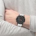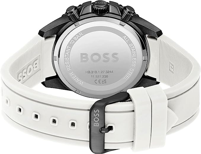 Мужские часы Hugo Boss Admiral HB1513966 представлены в круглом 46-мм корпусе из нержавеющей стали с IP-покрытиемIP-покрытиеМетод ионного напыления. Демонстрирует повышенную устойчивость к истиранию, окислению и химическим веществам. Под воздействием высокого давления и температуры около 1500°C молекулы металла надёжно соединяются с частицами корпуса часов.. Оснащены кварцевым механизмом с функциями хронографаХронографФункция позволяет измерять отрезки времени с особой точностью: часы, минуты, секунды. Верным признаком хронографа является наличие на циферблате 3 дополнительных окошек-счётчиков. и секундомеромСекундомерСекундоме́р — прибор, способный измерять интервалы времени с точностью до долей секунды. на безелеБезельВнешний ободок, закрепляющий стекло. В спортивных часах так называется поворотное кольцо с делениями на циферблате, выполняет роль таймера – замеряет отрезки времени на шкале. Неподвижный безель – элемент декора. Однонаправленно вращающийся безель на дайверских часах позволяет фиксировать моменты погружения и выныривания на поверхность.. Черный циферблат защищен устойчивым к царапинам минеральным стекломМинеральное стеклоМинеральное стекло представляет собой искусственно выращенный минерал кварца. Такое стекло отличается особой устойчивостью к повреждениям и царапинам. Уступает по некоторым качествам сапфировому стеклу.. Силиконовый ремешок белого цвета дополнен стандартной застежкой, а стрелки покрыты люминесцентным составомЛюминесцентное покрытиеПозволяет считывать показания времени в темноте. Производители наносят на стрелки, часовые индексы, безель или поверхность циферблата светонакопительный состав, дающий холодное свечение. для видимости в темноте. Водонепроницаемость 100 метров (10 ATM) позволяет использовать часы для плавания.