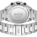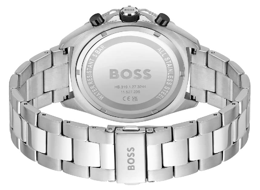 Мужские часы Hugo Boss Energy HB1513971 представлены в круглом 44-мм корпусе из нержавеющей стали с частичным IP-покрытиемIP-покрытиеМетод ионного напыления. Демонстрирует повышенную устойчивость к истиранию, окислению и химическим веществам. Под воздействием высокого давления и температуры около 1500°C молекулы металла надёжно соединяются с частицами корпуса часов.. Оснащены кварцевым механизмом с функциями хронографаХронографФункция позволяет измерять отрезки времени с особой точностью: часы, минуты, секунды. Верным признаком хронографа является наличие на циферблате 3 дополнительных окошек-счётчиков., секундомеромСекундомерСекундоме́р — прибор, способный измерять интервалы времени с точностью до долей секунды. и тахиметромТахиметрРазмеченная шкала, располагается на ободке или безеле часов. Тахиметр позволяет рассчитать скорость на определённом участке пути, расстояние измеряется в километрах или милях. на безелеБезельВнешний ободок, закрепляющий стекло. В спортивных часах так называется поворотное кольцо с делениями на циферблате, выполняет роль таймера – замеряет отрезки времени на шкале. Неподвижный безель – элемент декора. Однонаправленно вращающийся безель на дайверских часах позволяет фиксировать моменты погружения и выныривания на поверхность.. Черный циферблат защищен устойчивым к царапинам минеральным стекломМинеральное стеклоМинеральное стекло представляет собой искусственно выращенный минерал кварца. Такое стекло отличается особой устойчивостью к повреждениям и царапинам. Уступает по некоторым качествам сапфировому стеклу.. Браслет из нержавеющей стали дополнен раскладной застёжкойРаскладная застёжкаТакой тип застёжки используется только на браслетах из металла. Она никогда не раскрывается полностью, происходит разделение на 2 и более частей. Раскладывающая застёжка снизит вероятность потери часов к минимуму., а стрелки покрыты люминесцентным составомЛюминесцентное покрытиеПозволяет считывать показания времени в темноте. Производители наносят на стрелки, часовые индексы, безель или поверхность циферблата светонакопительный состав, дающий холодное свечение. для видимости в темноте. Водонепроницаемость 50 метров (5 ATM) позволяет использовать часы для плавания.