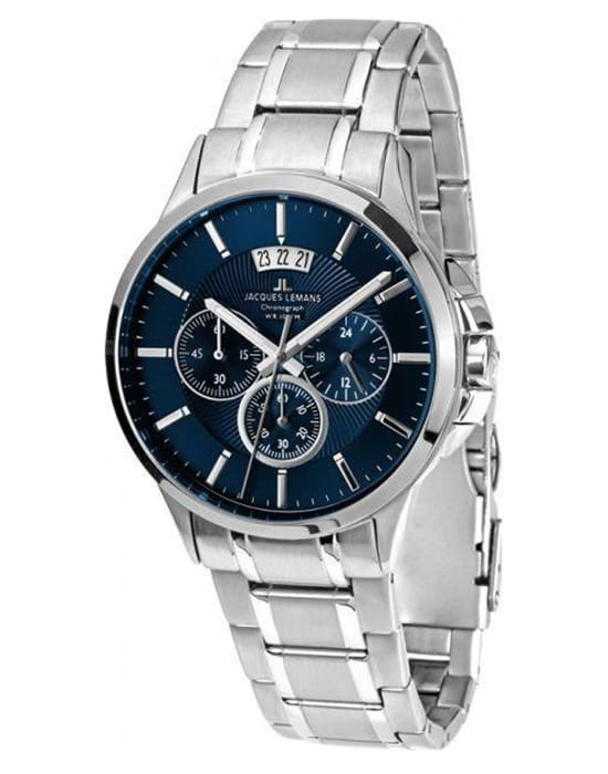 Наручные часы-хронографХронографФункция позволяет измерять отрезки времени с особой точностью: часы, минуты, секунды. Верным признаком хронографа является наличие на циферблате 3 дополнительных окошек-счётчиков. Jacques Lemans с датой, 12/24-часовым форматом времени и секундомеромСекундомерСекундоме́р — прибор, способный измерять интервалы времени с точностью до долей секунды. призваны ставить на первое место индивидуальный стиль владельца, классическая элегантность придётся по вкусу каждому. Брендовые часы привлекают минималистичным дизайном, отсутствие вычурности и обилия декорирующих элементов делают модель лучшим решением для ежедневного применения. Аксессуар можно носить с деловыми костюмами и повседневной одеждой, он органично сочетается как с классическими брюками, так и с рваными джинсами. Это настоящее часовое искусство высокого качества, часы считаются актуальным вариантом на все времена и с идеальной точностью показывают время благодаря надёжному японскому механизму.