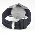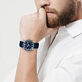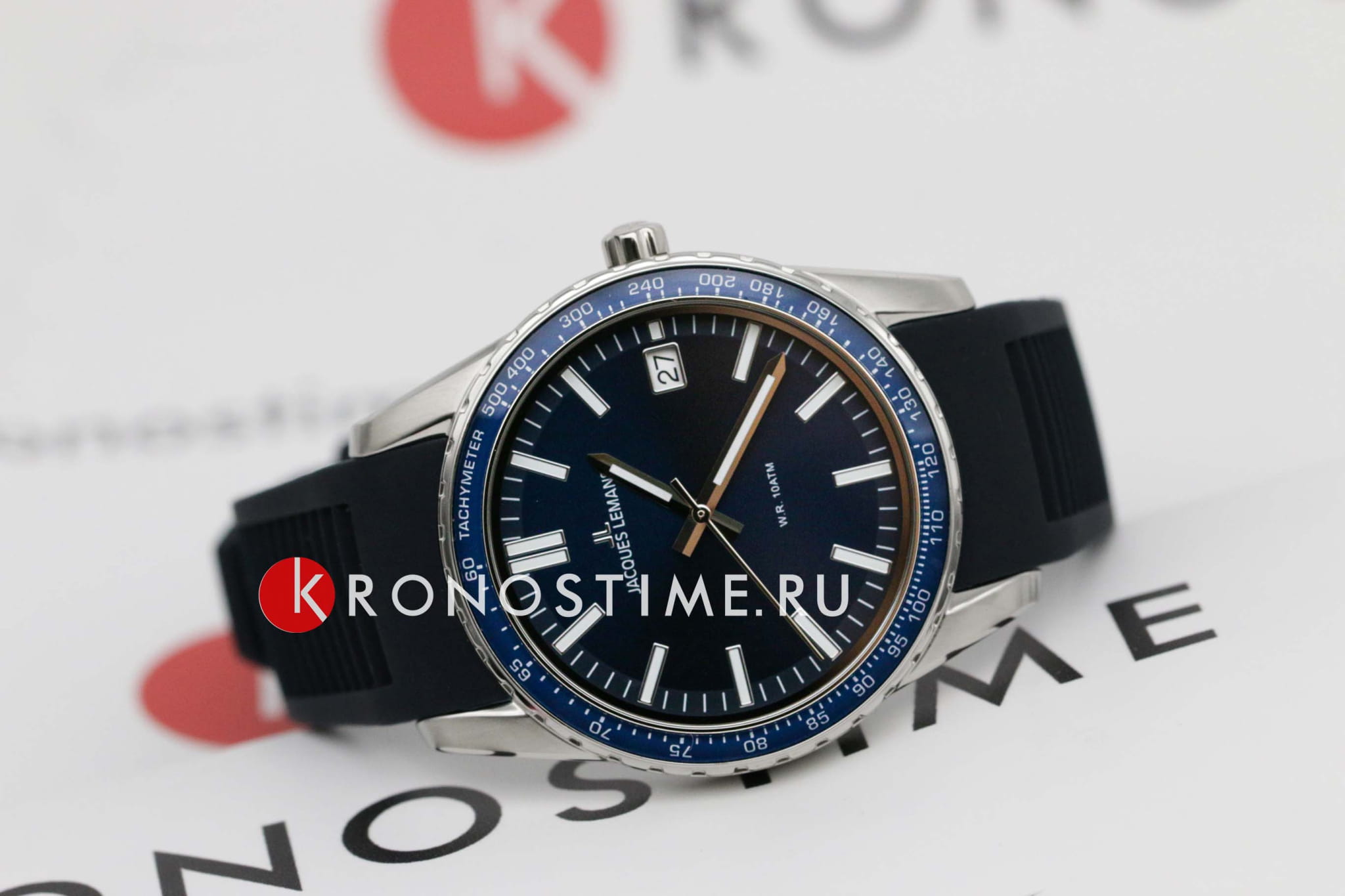 тахиметраТахиметрРазмеченная шкала, располагается на ободке или безеле часов. Тахиметр позволяет рассчитать скорость на определённом участке пути, расстояние измеряется в километрах или милях. вынесена на безельБезельВнешний ободок, закрепляющий стекло. В спортивных часах так называется поворотное кольцо с делениями на циферблате, выполняет роль таймера – замеряет отрезки времени на шкале. Неподвижный безель – элемент декора. Однонаправленно вращающийся безель на дайверских часах позволяет фиксировать моменты погружения и выныривания на поверхность.. В часах установлено ударопрочное минеральное стеклоМинеральное стеклоМинеральное стекло представляет собой искусственно выращенный минерал кварца. Такое стекло отличается особой устойчивостью к повреждениям и царапинам. Уступает по некоторым качествам сапфировому стеклу. Crystex. Повышенная водостойкость равна 10 атмосфер. Для создания ремешка был выбран силикон синего цвета. Силиконовый ремешок не деформируется со временем, не боится повышенной влажности и позволяет коже запястья дышать.