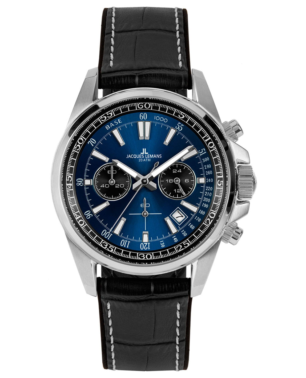 Мужские часы Jacques Lemans Liverpool 1-2117S с минеральным стекломМинеральное стеклоМинеральное стекло представляет собой искусственно выращенный минерал кварца. Такое стекло отличается особой устойчивостью к повреждениям и царапинам. Уступает по некоторым качествам сапфировому стеклу., кварцевый механизм с высокой точностью. Часы- хронографХронографФункция позволяет измерять отрезки времени с особой точностью: часы, минуты, секунды. Верным признаком хронографа является наличие на циферблате 3 дополнительных окошек-счётчиков. с секундомеромСекундомерСекундоме́р — прибор, способный измерять интервалы времени с точностью до долей секунды. представляют собой стильный аксессуар, отражающий идеальное сочетание современного дизайна, надёжности и функциональности.  Корпус и безельБезельВнешний ободок, закрепляющий стекло. В спортивных часах так называется поворотное кольцо с делениями на циферблате, выполняет роль таймера – замеряет отрезки времени на шкале. Неподвижный безель – элемент декора. Однонаправленно вращающийся безель на дайверских часах позволяет фиксировать моменты погружения и выныривания на поверхность. из нержавеющей стали с тахиметромТахиметрРазмеченная шкала, располагается на ободке или безеле часов. Тахиметр позволяет рассчитать скорость на определённом участке пути, расстояние измеряется в километрах или милях.. На циферблате расположены два дополнительных индикатора и окошко даты. Окно даты расположено между 4 и 5 часами. Стрелки и метки с люминесцентным покрытиемЛюминесцентное покрытиеПозволяет считывать показания времени в темноте. Производители наносят на стрелки, часовые индексы, безель или поверхность циферблата светонакопительный состав, дающий холодное свечение.. Класс водозащиты: 200 метров, позволит плавать, нырять и заниматься другими водными видами спорта. Рифленая заводная головка с защитой. Ремешок из натуральной кожи (верхняя часть) и силикона (внутренняя часть) на стандартной застежке.