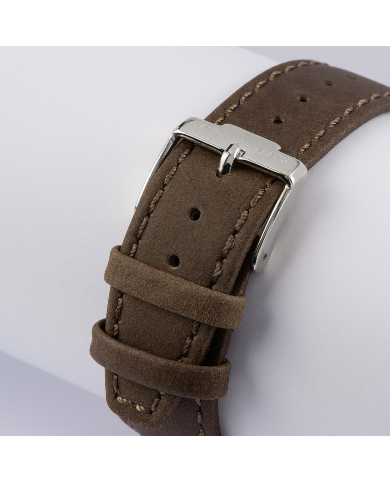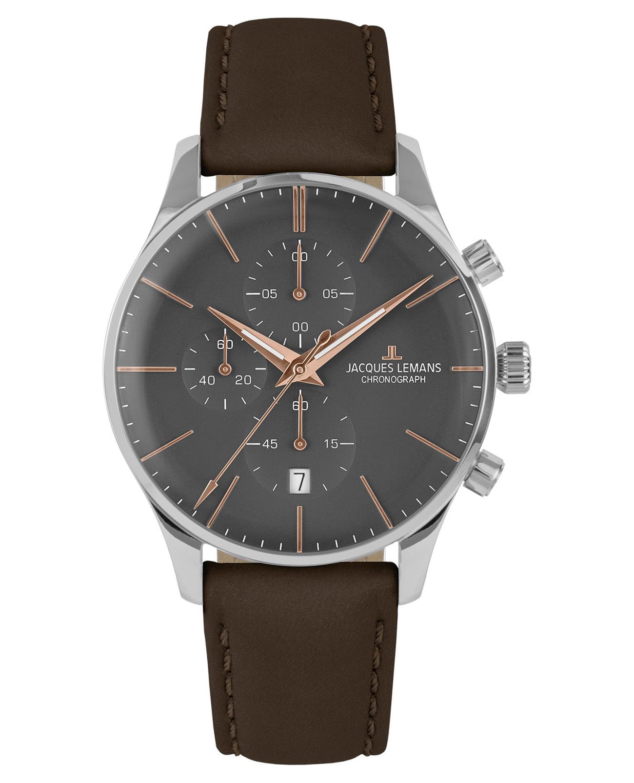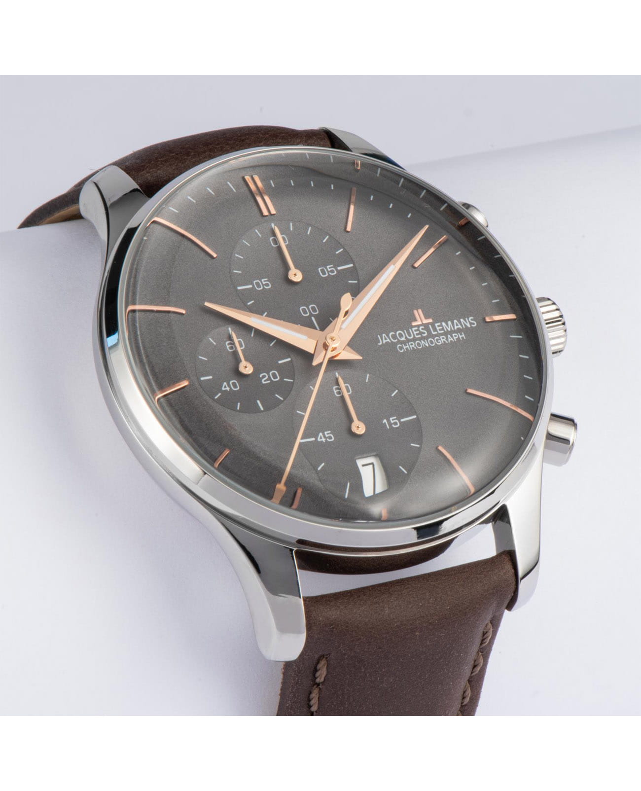 Мужские часы-хронографХронографФункция позволяет измерять отрезки времени с особой точностью: часы, минуты, секунды. Верным признаком хронографа является наличие на циферблате 3 дополнительных окошек-счётчиков. с секундомеромСекундомерСекундоме́р — прибор, способный измерять интервалы времени с точностью до долей секунды. Jacques Lemans Classic 1-2163E, кварцевый механизм с высокой точностью.  Минеральное стеклоМинеральное стеклоМинеральное стекло представляет собой искусственно выращенный минерал кварца. Такое стекло отличается особой устойчивостью к повреждениям и царапинам. Уступает по некоторым качествам сапфировому стеклу. устойчивое к мелким механическим повреждениям. Корпус часов изготовлен из стали. Окошко даты находится в положении 6 часов. Стрелки с люминесцентным покрытиемЛюминесцентное покрытиеПозволяет считывать показания времени в темноте. Производители наносят на стрелки, часовые индексы, безель или поверхность циферблата светонакопительный состав, дающий холодное свечение.. Класс водозащиты: 50 метров, позволит плавать, нырять и заниматься другими водными видами спорта. Кожаный ремешок на стандартной застёжке.