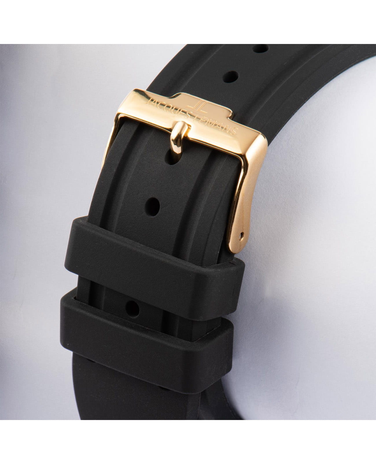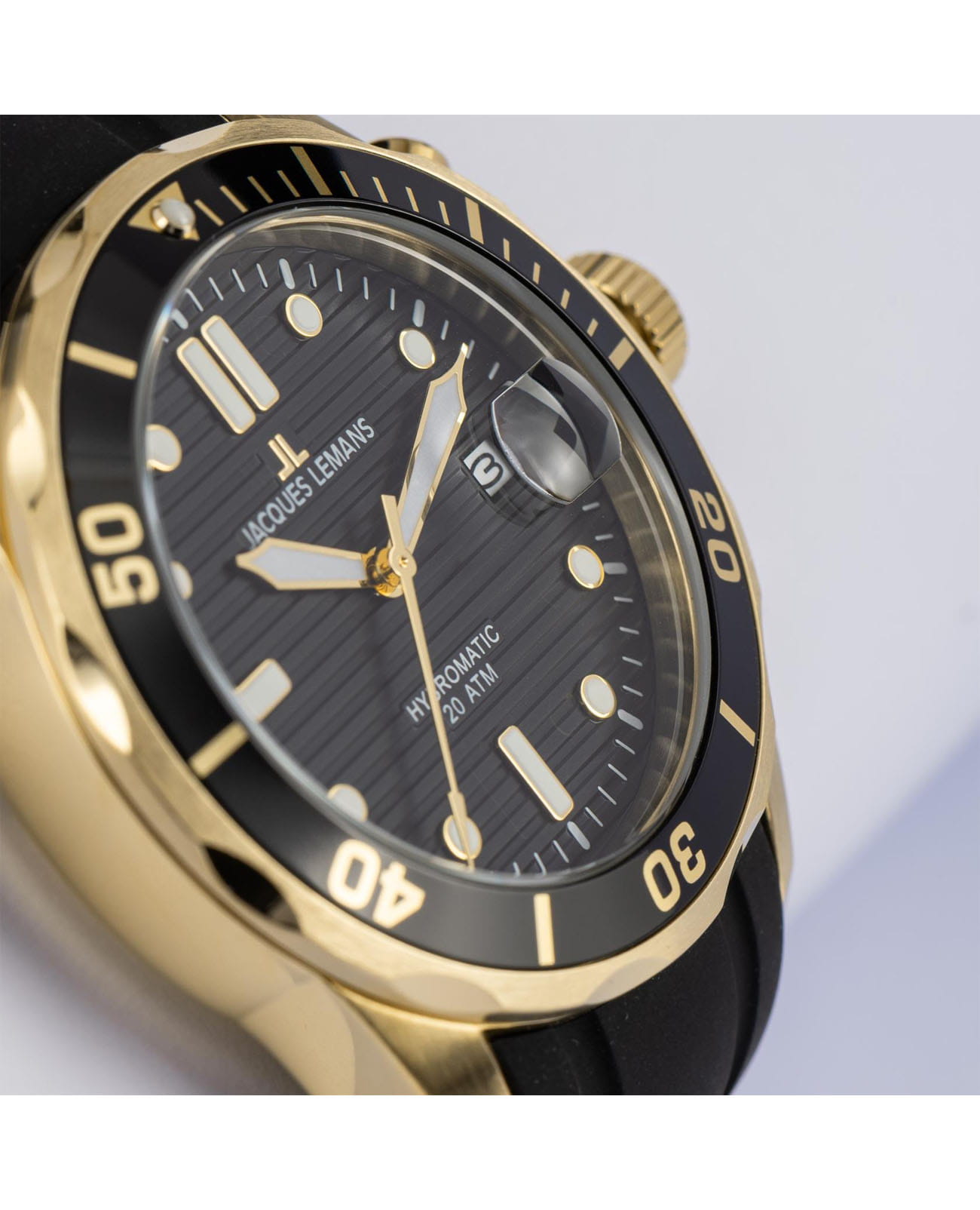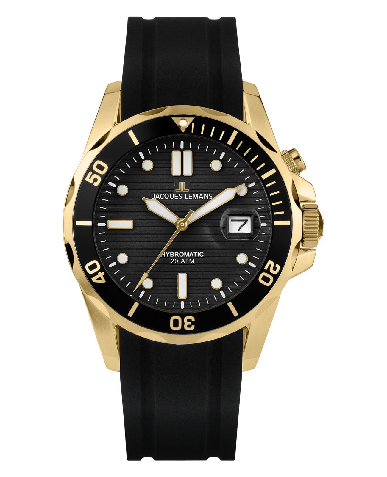 Мужские часы Jacques Lemans Hybromatic 1-2170F с минеральным стекломМинеральное стеклоМинеральное стекло представляет собой искусственно выращенный минерал кварца. Такое стекло отличается особой устойчивостью к повреждениям и царапинам. Уступает по некоторым качествам сапфировому стеклу., гибрид кварца и механики с автоподзаводом. Корпус выполенен из нержавеющей стали с PVD-покрытиемPVDУльтратонкое покрытие наносится в технике вакуумного напыления, сочетает в себе нитрид титана особой прочности со слоем золота или оксида хрома. Несёт в себе декоративную или защитную функцию.. Вращающийся безельБезельВнешний ободок, закрепляющий стекло. В спортивных часах так называется поворотное кольцо с делениями на циферблате, выполняет роль таймера – замеряет отрезки времени на шкале. Неподвижный безель – элемент декора. Однонаправленно вращающийся безель на дайверских часах позволяет фиксировать моменты погружения и выныривания на поверхность. из нержавеющей стали с PVDPVDУльтратонкое покрытие наносится в технике вакуумного напыления, сочетает в себе нитрид титана особой прочности со слоем золота или оксида хрома. Несёт в себе декоративную или защитную функцию. покрытием. Стрелки и метки с люминесцентным покрытиемЛюминесцентное покрытиеПозволяет считывать показания времени в темноте. Производители наносят на стрелки, часовые индексы, безель или поверхность циферблата светонакопительный состав, дающий холодное свечение.. Окошко даты находится в положении 3 часов. Класс водозащиты: 200 метров, позволит плавать, нырять и заниматься другими водными видами спорта. Силиконовый ремешок на стандартной застежке.