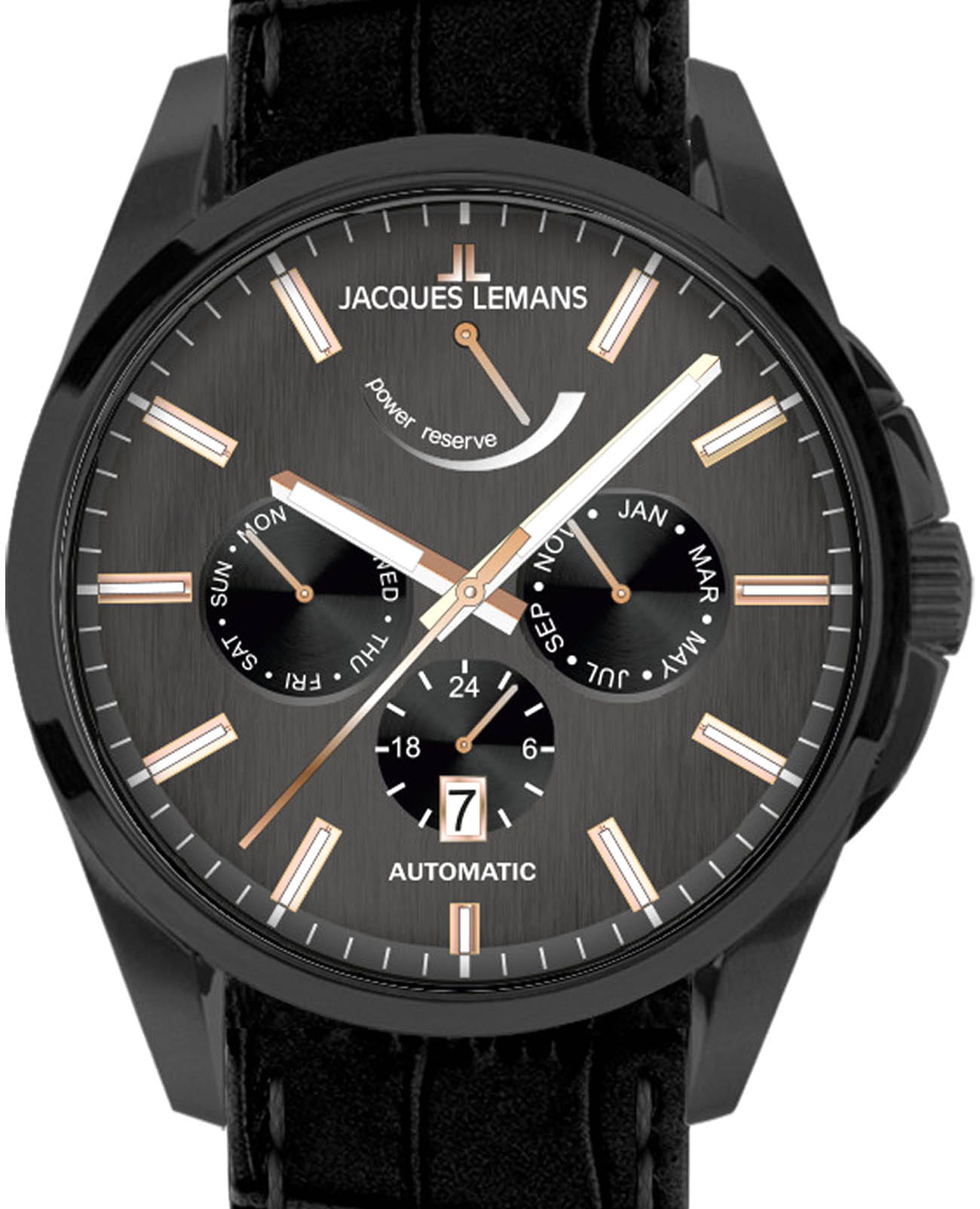 Мужские механические часы с автоподзаводом Jacques Lemans 1-2204K – лаконичная красота и изысканная элегантность. Оригинальная модель с классическим оформлением станет превосходным завершением образа, наделив его индивидуальным характером. Корпус выполнен из нержавеющей стали с PVD-покрытиемPVDУльтратонкое покрытие наносится в технике вакуумного напыления, сочетает в себе нитрид титана особой прочности со слоем золота или оксида хрома. Несёт в себе декоративную или защитную функцию. черного цвета, диаметром 44 мм, что обеспечивает долговечность и утончённый внешний вид. Минеральное стеклоМинеральное стеклоМинеральное стекло представляет собой искусственно выращенный минерал кварца. Такое стекло отличается особой устойчивостью к повреждениям и царапинам. Уступает по некоторым качествам сапфировому стеклу. с сапфировым напылением защищает циферблат от царапин. Кожаный ремешок на стандартной застёжке обеспечивает комфортное ношение. Водозащита 100 метров позволит плавать, нырять и заниматься другими водными видами спорта. Стрелки и метки с люминесцентным покрытиемЛюминесцентное покрытиеПозволяет считывать показания времени в темноте. Производители наносят на стрелки, часовые индексы, безель или поверхность циферблата светонакопительный состав, дающий холодное свечение. позволяющие легко определять время даже в темноте. 12-ти и 24-х часовой формат времени. День недели и месяц вынесены на отдельные циферблаты. Окошко даты находится в положении 6 часов. Рифленая заводная головка с защитой. Это аксессуар для мужчины, который ценит классический стиль и функциональность.