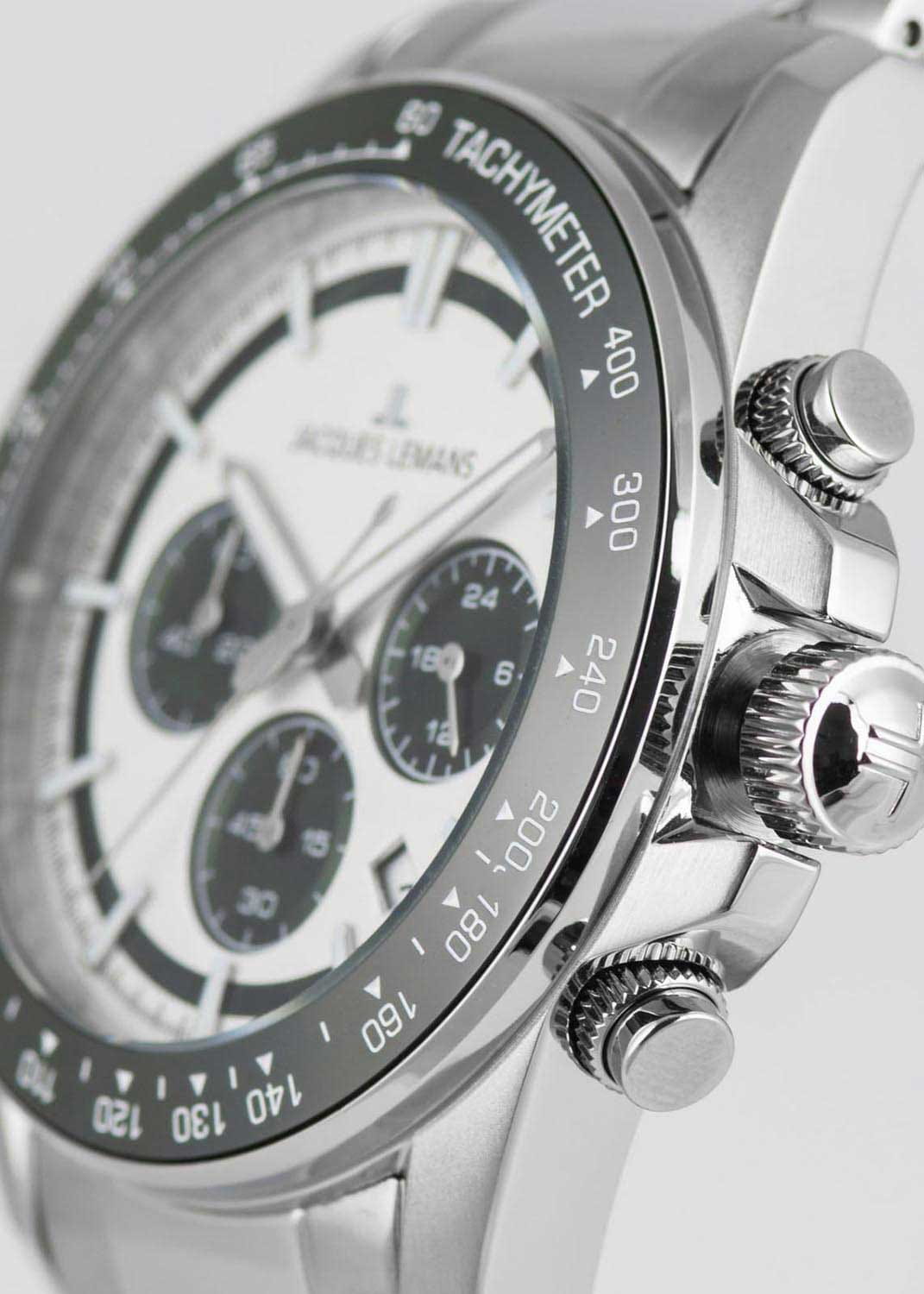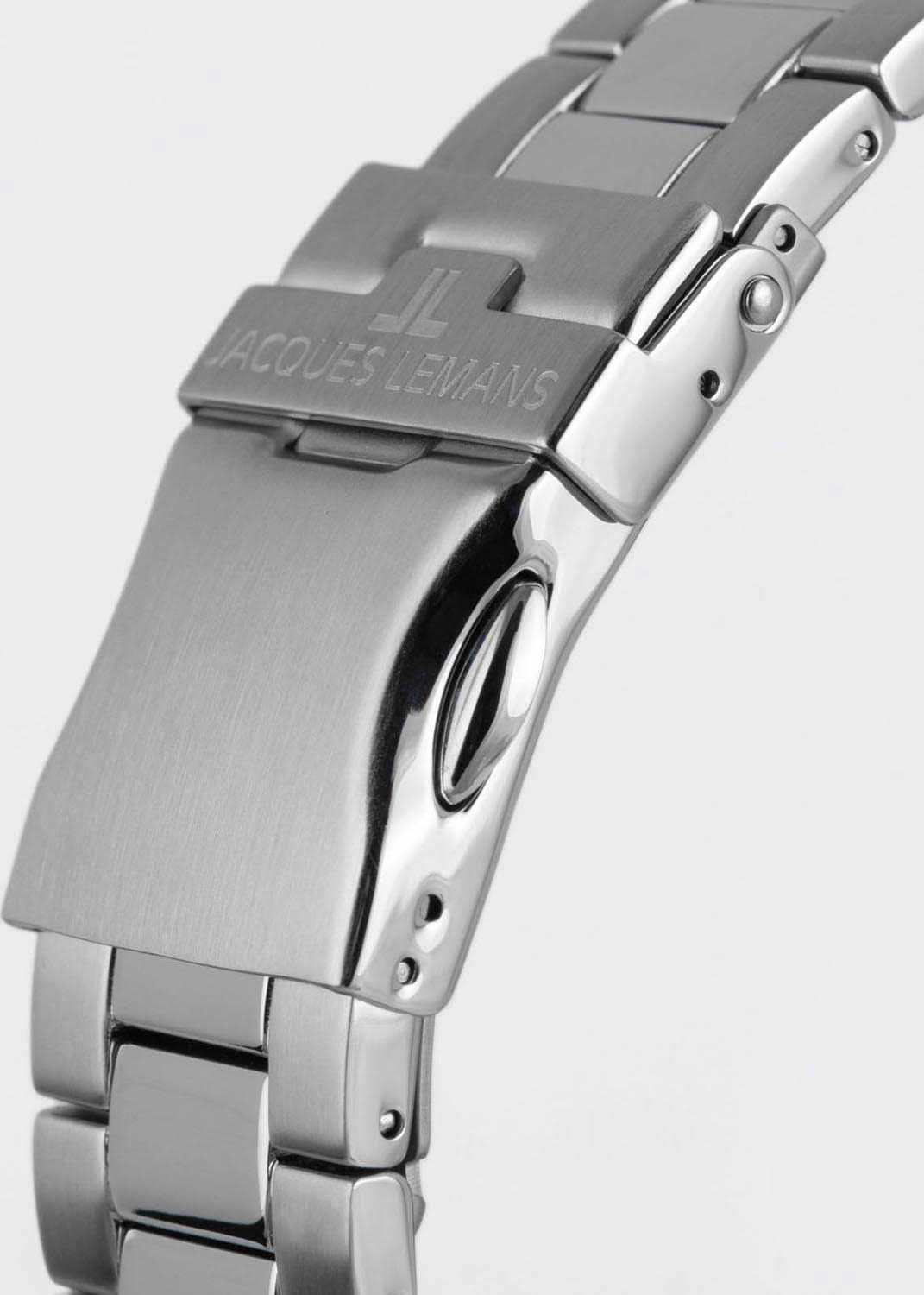 Мужские кварцевые часы-хронографХронографФункция позволяет измерять отрезки времени с особой точностью: часы, минуты, секунды. Верным признаком хронографа является наличие на циферблате 3 дополнительных окошек-счётчиков. с секундомеромСекундомерСекундоме́р — прибор, способный измерять интервалы времени с точностью до долей секунды. Jacques Lemans 1-2207E – лаконичная красота и изысканная элегантность. Оригинальная модель с классическим оформлением станет превосходным завершением образа, наделив его индивидуальным характером. Корпус выполнен из нержавеющей стали серебристого цвета, диаметром 43 мм, что обеспечивает долговечность и утончённый внешний вид. Минеральное стеклоМинеральное стеклоМинеральное стекло представляет собой искусственно выращенный минерал кварца. Такое стекло отличается особой устойчивостью к повреждениям и царапинам. Уступает по некоторым качествам сапфировому стеклу. повышенной прочности Crystex защищает циферблат от царапин. Неподвижный безельБезельВнешний ободок, закрепляющий стекло. В спортивных часах так называется поворотное кольцо с делениями на циферблате, выполняет роль таймера – замеряет отрезки времени на шкале. Неподвижный безель – элемент декора. Однонаправленно вращающийся безель на дайверских часах позволяет фиксировать моменты погружения и выныривания на поверхность. с PVD-покрытиемPVDУльтратонкое покрытие наносится в технике вакуумного напыления, сочетает в себе нитрид титана особой прочности со слоем золота или оксида хрома. Несёт в себе декоративную или защитную функцию. и тахиметромТахиметрРазмеченная шкала, располагается на ободке или безеле часов. Тахиметр позволяет рассчитать скорость на определённом участке пути, расстояние измеряется в километрах или милях.. Стальной браслет на раскладной застёжке с фиксаторомРаскладная застёжкаТакой тип застёжки используется только на браслетах из металла. Она никогда не раскрывается полностью, происходит разделение на 2 и более частей. Раскладывающая застёжка снизит вероятность потери часов к минимуму. обеспечивает комфортное ношение Водозащита 200 метров позволит плавать, нырять и заниматься другими водными видами спорта. Стрелки и метки с люминесцентным покрытиемЛюминесцентное покрытиеПозволяет считывать показания времени в темноте. Производители наносят на стрелки, часовые индексы, безель или поверхность циферблата светонакопительный состав, дающий холодное свечение. позволяющие легко определять время даже в темноте. 12-ти и 24-х часовой формат времени. Окошко даты находится в положении между 4 и 5 часами. Рифленая заводная головка с защитой. Это аксессуар для мужчины, который ценит классический стиль и функциональность.