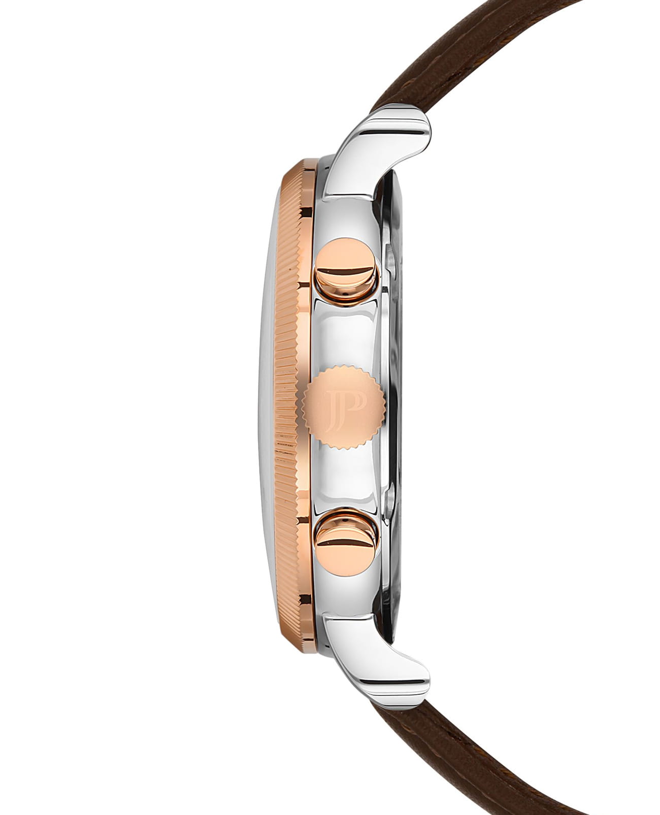 Швейцарские мужские часы-хронографХронографФункция позволяет измерять отрезки времени с особой точностью: часы, минуты, секунды. Верным признаком хронографа является наличие на циферблате 3 дополнительных окошек-счётчиков. с секундомеромСекундомерСекундоме́р — прибор, способный измерять интервалы времени с точностью до долей секунды. Jacques Philippe Vintage JPQGC197123, кварцевый механизм с высокой точностью. Сапфировое стеклоСапфировое стеклоПрочный и надёжный материал из кристалла сапфира синтетического происхождения, характеризующийся особой твёрдостью и устойчивостью к царапинам и повреждениям. устойчивое к появлению царапин, обладающее высокой прозрачностью. Корпус часов изготовлен из нержавеющей стали. БезельБезельВнешний ободок, закрепляющий стекло. В спортивных часах так называется поворотное кольцо с делениями на циферблате, выполняет роль таймера – замеряет отрезки времени на шкале. Неподвижный безель – элемент декора. Однонаправленно вращающийся безель на дайверских часах позволяет фиксировать моменты погружения и выныривания на поверхность. из стали с IP-покрытиемIP-покрытиеМетод ионного напыления. Демонстрирует повышенную устойчивость к истиранию, окислению и химическим веществам. Под воздействием высокого давления и температуры около 1500°C молекулы металла надёжно соединяются с частицами корпуса часов.. На циферблате три дополнительных индикатора. Окошко даты находится между 4 и 5 часами. Класс водозащиты: 50 метров, позволит защитить корпус от случайных брызг или капель дождя. Кожаный ремешок на стандартной застёжке.