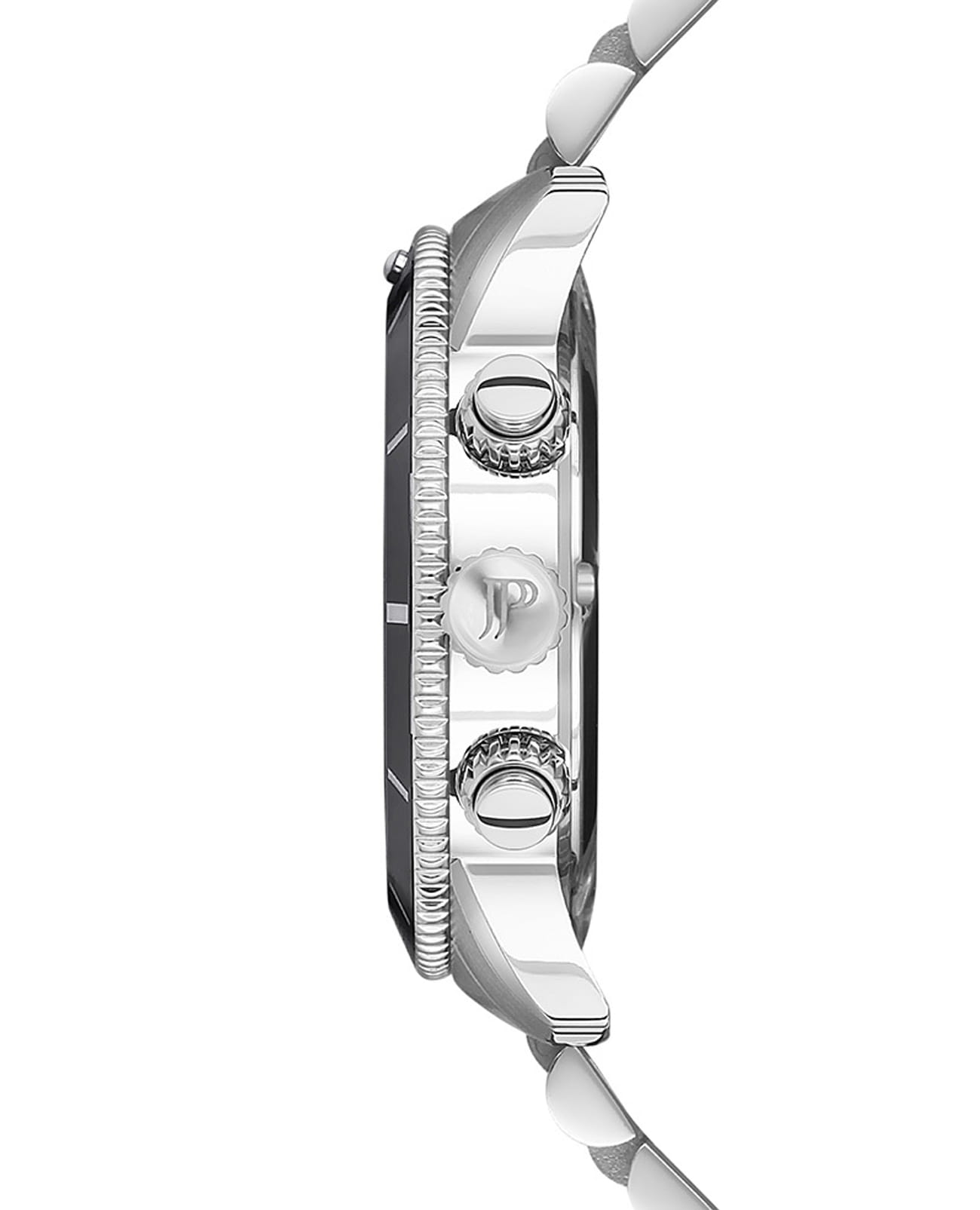 Швейцарские мужские часы-хронографХронографФункция позволяет измерять отрезки времени с особой точностью: часы, минуты, секунды. Верным признаком хронографа является наличие на циферблате 3 дополнительных окошек-счётчиков. с секундомеромСекундомерСекундоме́р — прибор, способный измерять интервалы времени с точностью до долей секунды. Jacques Philippe Victory JPQGC271316, кварцевый механизм с высокой точностью. Сапфировое стеклоСапфировое стеклоПрочный и надёжный материал из кристалла сапфира синтетического происхождения, характеризующийся особой твёрдостью и устойчивостью к царапинам и повреждениям. устойчивое к появлению царапин, обладающее высокой прозрачностью. Корпус часов изготовлен из нержавеющей стали. БезельБезельВнешний ободок, закрепляющий стекло. В спортивных часах так называется поворотное кольцо с делениями на циферблате, выполняет роль таймера – замеряет отрезки времени на шкале. Неподвижный безель – элемент декора. Однонаправленно вращающийся безель на дайверских часах позволяет фиксировать моменты погружения и выныривания на поверхность. из стали с IP-покрытиемIP-покрытиеМетод ионного напыления. Демонстрирует повышенную устойчивость к истиранию, окислению и химическим веществам. Под воздействием высокого давления и температуры около 1500°C молекулы металла надёжно соединяются с частицами корпуса часов.. На циферблате три дополнительных индикатора. Окошко даты находится в положении 6 часов. Стрелки с люминесцентным покрытиемЛюминесцентное покрытиеПозволяет считывать показания времени в темноте. Производители наносят на стрелки, часовые индексы, безель или поверхность циферблата светонакопительный состав, дающий холодное свечение.. Класс водозащиты: 100 метров, позволит плавать, нырять и заниматься другими водными видами спорта. Стальной браслет на застёжке «бабочка» с кнопкамиЗастёжка "бабочка"Такой вид застёжки дополняется предохранителями, помогающими избежать случайного раскрытия браслета. Обладают изящным исполнением. .