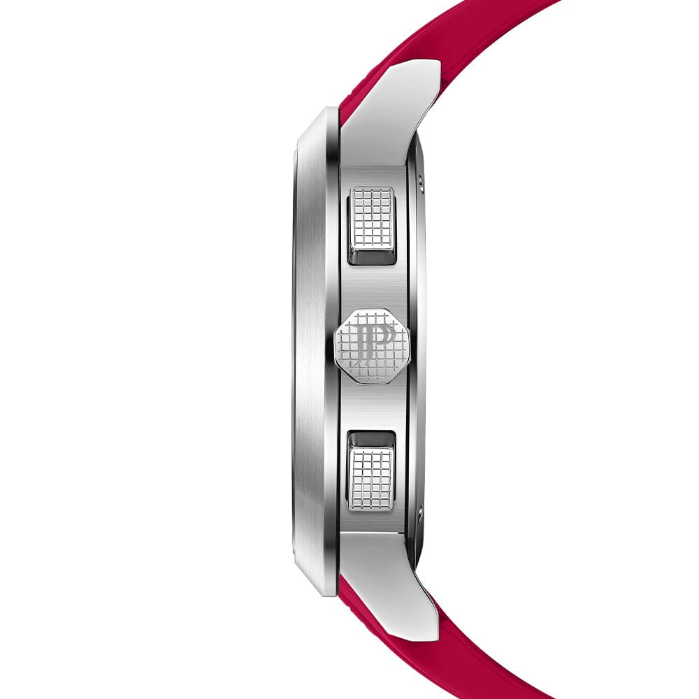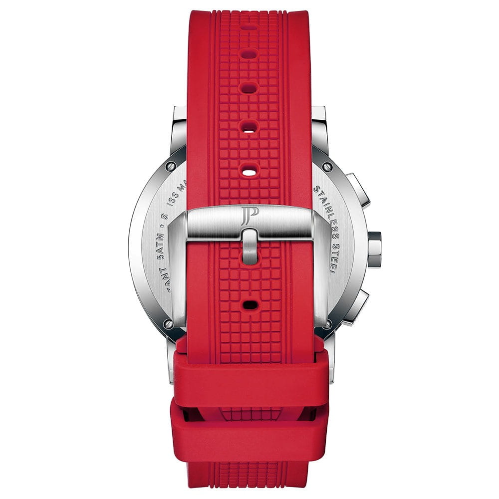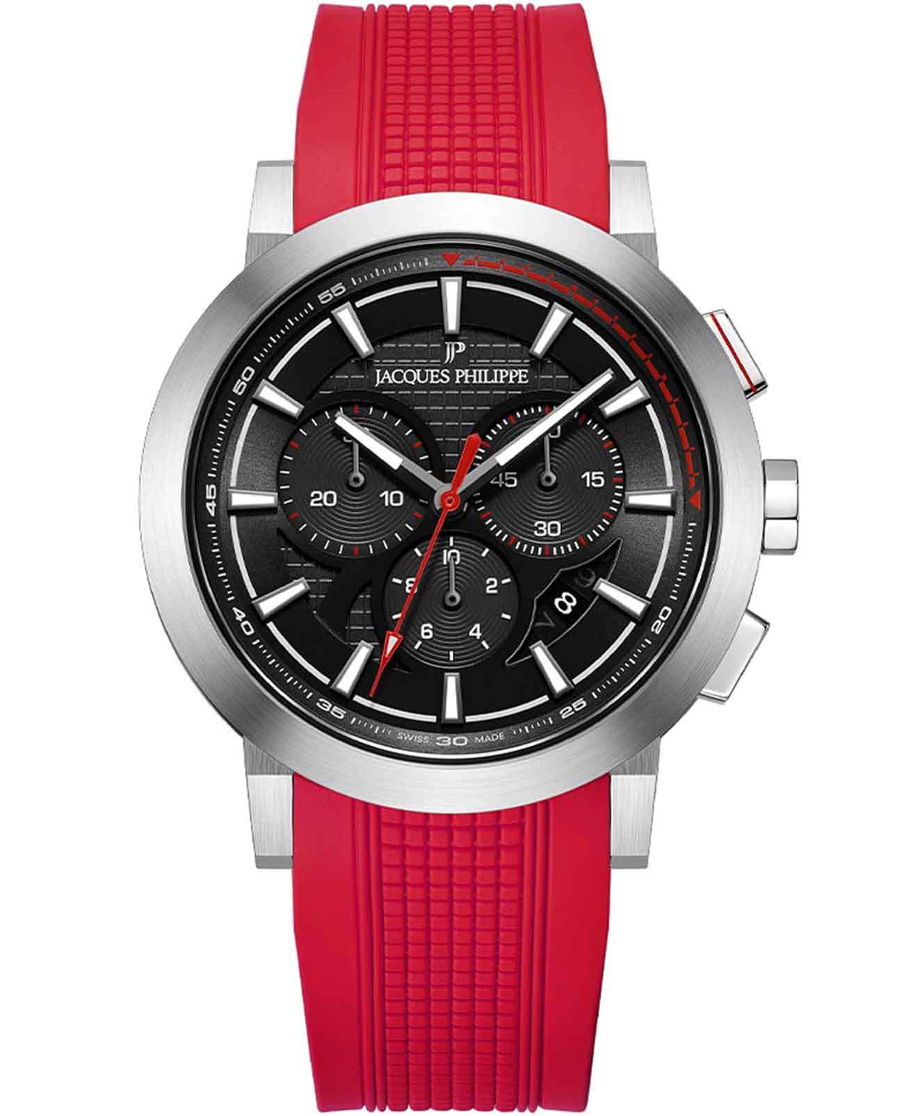 Jacques Philippe Corus JPQGC37141XR — стильные швейцарские часы с функцией хронографаХронографФункция позволяет измерять отрезки времени с особой точностью: часы, минуты, секунды. Верным признаком хронографа является наличие на циферблате 3 дополнительных окошек-счётчиков. и секундомераСекундомерСекундоме́р — прибор, способный измерять интервалы времени с точностью до долей секунды., которые сочетают в себе элегантность и современный функционал. Модель оснащена точным кварцевым механизмом и надежным корпусом из нержавеющей стали 316L, что гарантирует долговечность и устойчивость к механическим воздействиям. Сапфировое стеклоСапфировое стеклоПрочный и надёжный материал из кристалла сапфира синтетического происхождения, характеризующийся особой твёрдостью и устойчивостью к царапинам и повреждениям. отличается высокой прозрачностью и устойчивостью к царапинам, сохраняя безупречный внешний вид часов даже при активном использовании. Черный циферблат украшен тремя дополнительными индикаторами и удобным окошком даты в положении «4 часа», а стрелки с люминесцентным покрытиемЛюминесцентное покрытиеПозволяет считывать показания времени в темноте. Производители наносят на стрелки, часовые индексы, безель или поверхность циферблата светонакопительный состав, дающий холодное свечение. обеспечивают отличную читаемость в любое время суток. Силиконовый красный ремешок обеспечивает комфортное прилегание и хорошо подходит для повседневной носки. Класс водозащиты 5 ATM (50 метров) позволяет не снимать часы во время мытья рук или прогулок под дождем.