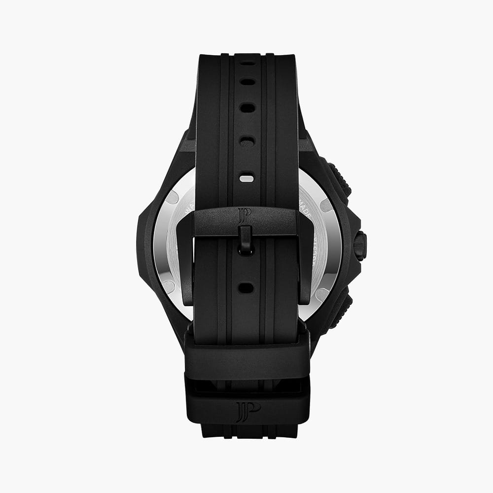 Часы Jacques Philippe JPQGC514411 из коллекции Militia — стильные швейцарские часы с функцией хронографаХронографФункция позволяет измерять отрезки времени с особой точностью: часы, минуты, секунды. Верным признаком хронографа является наличие на циферблате 3 дополнительных окошек-счётчиков. и секундомераСекундомерСекундоме́р — прибор, способный измерять интервалы времени с точностью до долей секунды., которые сочетают в себе элегантность и современный функционал. Модель оснащена надежным кварцевым механизмом, обеспечивающим высокую точность хода. Корпус выполнен из нержавеющей стали 316L с износостойким черным IP-покрытиемIP-покрытиеМетод ионного напыления. Демонстрирует повышенную устойчивость к истиранию, окислению и химическим веществам. Под воздействием высокого давления и температуры около 1500°C молекулы металла надёжно соединяются с частицами корпуса часов., диаметр корпуса составляет 48 мм, толщина — 12,5 мм. Сапфировое стеклоСапфировое стеклоПрочный и надёжный материал из кристалла сапфира синтетического происхождения, характеризующийся особой твёрдостью и устойчивостью к царапинам и повреждениям. защищает часы от царапин и сохраняет прозрачность даже при активном использовании. Черный циферблат дополнен тремя дополнительными индикаторами и окошком даты в положении 4 часа, а стрелки имеют люминесцентное покрытиеЛюминесцентное покрытиеПозволяет считывать показания времени в темноте. Производители наносят на стрелки, часовые индексы, безель или поверхность циферблата светонакопительный состав, дающий холодное свечение. для удобства чтения времени в темноте. Силиконовый браслет шириной 26 мм и длиной 19 см надежно фиксируется на запястье стандартной застежкой и обеспечивает комфорт при носке. Водозащита 5 АТМ позволяет не снимать часы при мытье рук или прогулках под дождём.