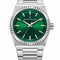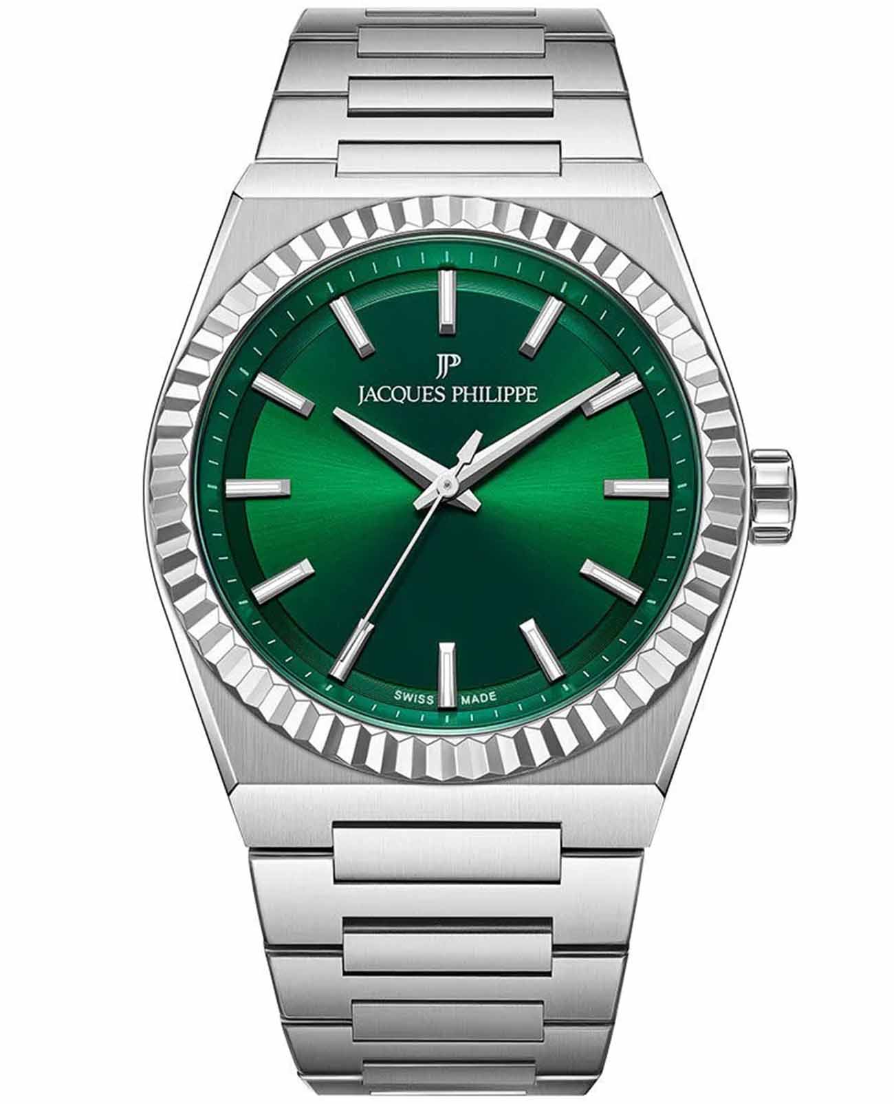 Часы Jacques Philippe Borealis JPQGC5713X6 — это воплощение швейцарских традиций часового мастерства в сочетании с современным дизайном. Модель оснащена надежным кварцевым механизмом RONDA 513 AIG2, который гарантирует точность и долговечность работы. Корпус и браслет выполнены из высококачественной нержавеющей стали 316L, что обеспечивает износостойкость и презентабельный внешний вид на протяжении долгого времени. Рифленый безельБезельВнешний ободок, закрепляющий стекло. В спортивных часах так называется поворотное кольцо с делениями на циферблате, выполняет роль таймера – замеряет отрезки времени на шкале. Неподвижный безель – элемент декора. Однонаправленно вращающийся безель на дайверских часах позволяет фиксировать моменты погружения и выныривания на поверхность. добавляет уникальности. Сапфировое стеклоСапфировое стеклоПрочный и надёжный материал из кристалла сапфира синтетического происхождения, характеризующийся особой твёрдостью и устойчивостью к царапинам и повреждениям. надежно защищает циферблат от царапин и сохраняет прозрачность даже при активной эксплуатации. Зеленый циферблат стильно контрастирует с серебристым корпусом, подчеркивая элегантность аксессуара. Часы комплектуются браслетом из нержавеющей стали 316L и застежкой «бабочка»Застёжка "бабочка"Такой вид застёжки дополняется предохранителями, помогающими избежать случайного раскрытия браслета. Обладают изящным исполнением. , раскладывающаяся при нажатии кнопок двойной блокировки. Часы оснащены функцией отображения даты, а завинчивающаяся заводная головка и водозащита до 5 АТМ делают эту модель отличным выбором для повседневного ношения и активного образа жизни.