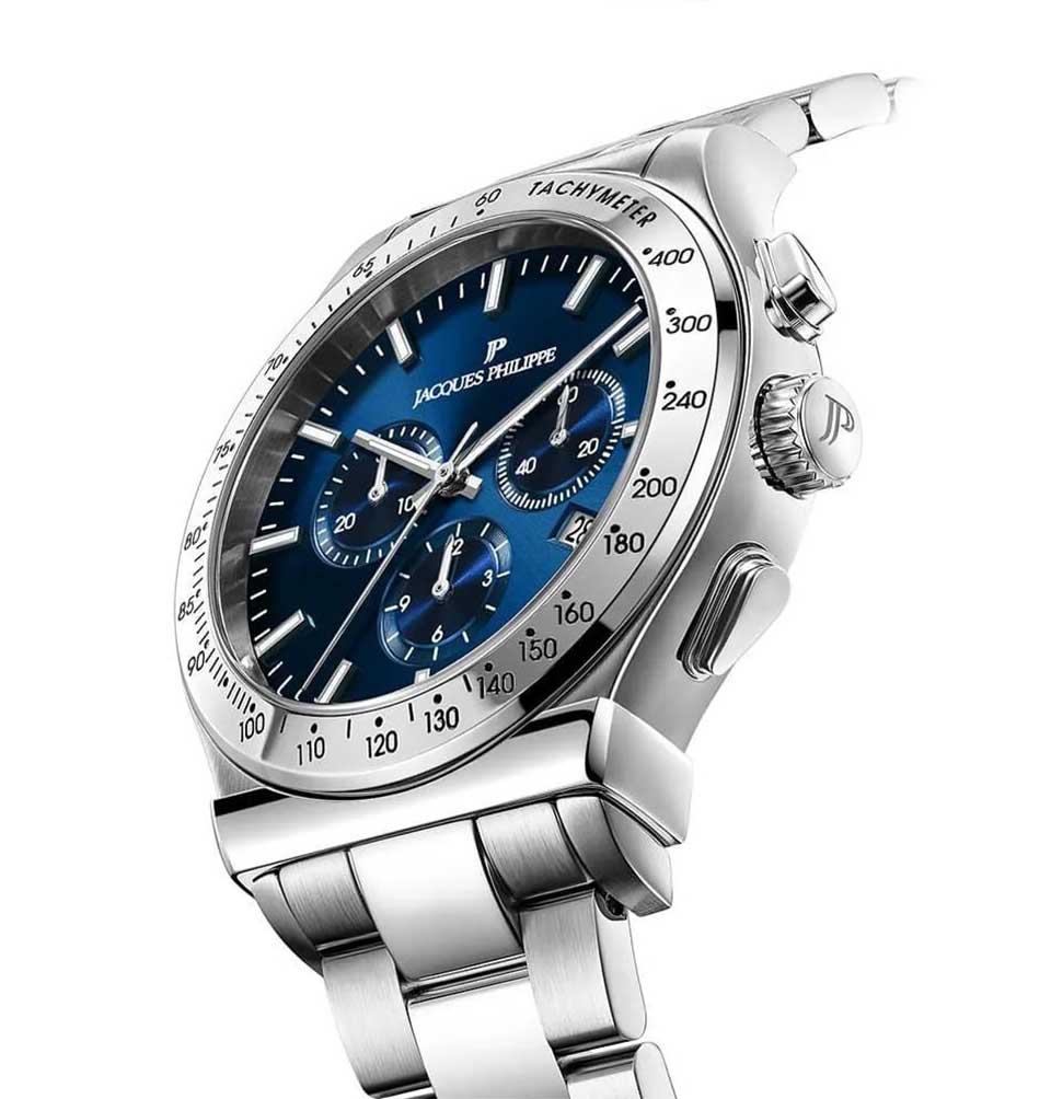 Jacques Philippe JPQGC701336 — швейцарские наручные часы, которые станут идеальным дополнением к образу современного мужчины, ценящего стиль и качество, это стильные швейцарские часы с функцией хронографаХронографФункция позволяет измерять отрезки времени с особой точностью: часы, минуты, секунды. Верным признаком хронографа является наличие на циферблате 3 дополнительных окошек-счётчиков. и секундомераСекундомерСекундоме́р — прибор, способный измерять интервалы времени с точностью до долей секунды.. Корпус и браслет выполнены из высокопрочной нержавеющей стали 316L, что подчеркивает статус владельца и гарантирует долговечность аксессуара. Классический дизайн с синим циферблатом гармонично сочетается с современными деталями: тахиметрическаяТахиметрРазмеченная шкала, располагается на ободке или безеле часов. Тахиметр позволяет рассчитать скорость на определённом участке пути, расстояние измеряется в километрах или милях. шкала на безелеБезельВнешний ободок, закрепляющий стекло. В спортивных часах так называется поворотное кольцо с делениями на циферблате, выполняет роль таймера – замеряет отрезки времени на шкале. Неподвижный безель – элемент декора. Однонаправленно вращающийся безель на дайверских часах позволяет фиксировать моменты погружения и выныривания на поверхность. добавляет функциональности, а окошко даты, расположенное на отметке «4 часа», обеспечивает дополнительное удобство. Сапфировое стеклоСапфировое стеклоПрочный и надёжный материал из кристалла сапфира синтетического происхождения, характеризующийся особой твёрдостью и устойчивостью к царапинам и повреждениям. надежно защищает часы от царапин и повреждений, сохраняя их безупречный внешний вид. Кварцевый механизм обеспечивает точный ход и не требует частого обслуживания. Водозащита до 10 атмосфер (100 метров) позволяет не снимать часы во время плавания. Стрелки имеют люминесцентное покрытиеЛюминесцентное покрытиеПозволяет считывать показания времени в темноте. Производители наносят на стрелки, часовые индексы, безель или поверхность циферблата светонакопительный состав, дающий холодное свечение. для удобства чтения времени в темноте. Стальной браслет шириной 20 мм оснащен застежкой «бабочка»Застёжка "бабочка"Такой вид застёжки дополняется предохранителями, помогающими избежать случайного раскрытия браслета. Обладают изящным исполнением. для комфортного ношения в течение всего дня.