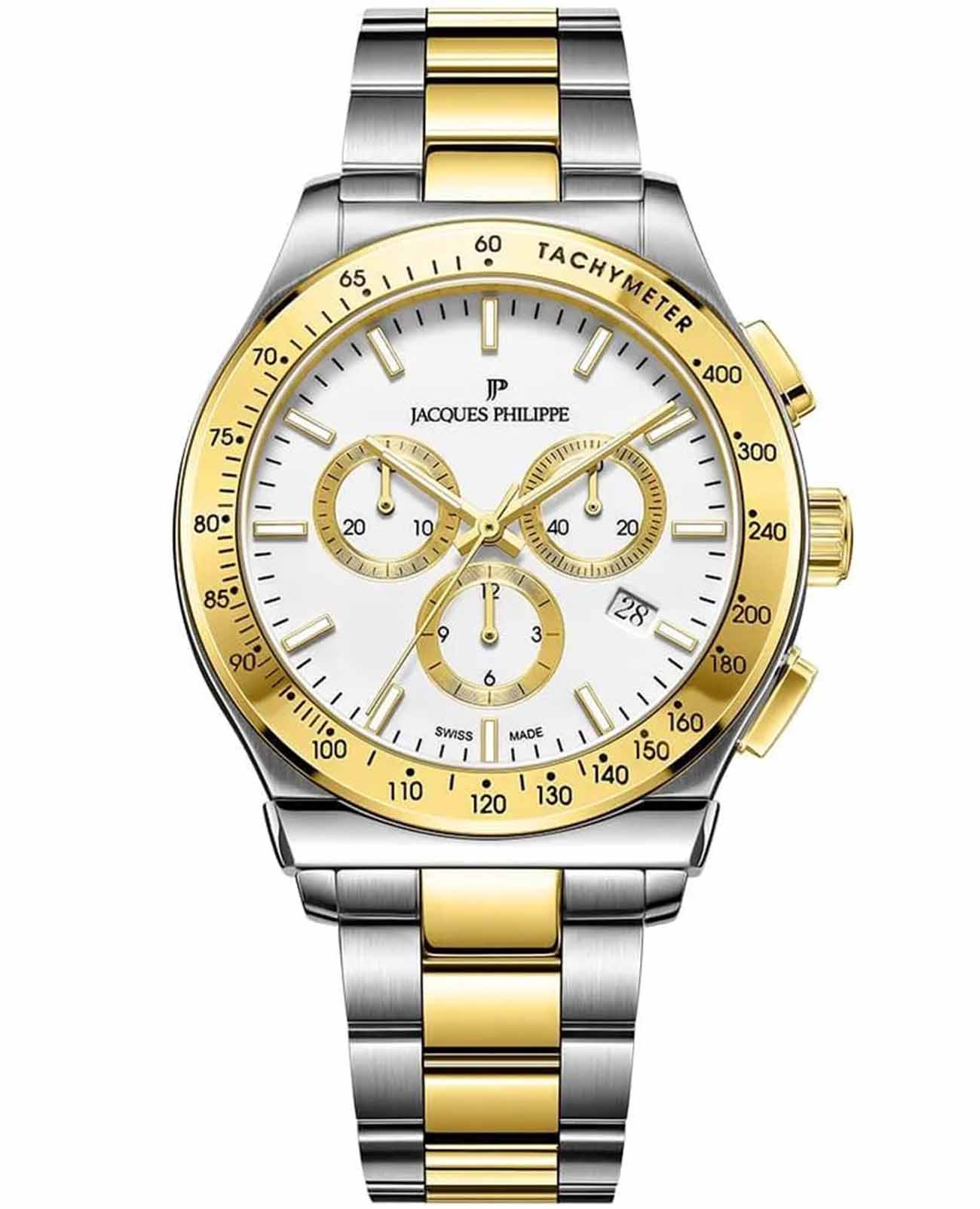 Jacques Philippe JPQGC707328 — швейцарские наручные часы, которые станут идеальным дополнением к образу современного мужчины, ценящего стиль и качество, это стильные швейцарские часы с функцией хронографаХронографФункция позволяет измерять отрезки времени с особой точностью: часы, минуты, секунды. Верным признаком хронографа является наличие на циферблате 3 дополнительных окошек-счётчиков. и секундомераСекундомерСекундоме́р — прибор, способный измерять интервалы времени с точностью до долей секунды.. Корпус и браслет выполнены из высокопрочной нержавеющей стали 316L, что подчеркивает статус владельца и гарантирует долговечность аксессуара. Классический дизайн с белым циферблатом гармонично сочетается с современными деталями: тахиметрическаяТахиметрРазмеченная шкала, располагается на ободке или безеле часов. Тахиметр позволяет рассчитать скорость на определённом участке пути, расстояние измеряется в километрах или милях. шкала на безелеБезельВнешний ободок, закрепляющий стекло. В спортивных часах так называется поворотное кольцо с делениями на циферблате, выполняет роль таймера – замеряет отрезки времени на шкале. Неподвижный безель – элемент декора. Однонаправленно вращающийся безель на дайверских часах позволяет фиксировать моменты погружения и выныривания на поверхность. с золотистым IP-покрытиемIP-покрытиеМетод ионного напыления. Демонстрирует повышенную устойчивость к истиранию, окислению и химическим веществам. Под воздействием высокого давления и температуры около 1500°C молекулы металла надёжно соединяются с частицами корпуса часов. добавляет функциональности, а окошко даты, расположенное на отметке «4 часа», обеспечивает дополнительное удобство. Сапфировое стеклоСапфировое стеклоПрочный и надёжный материал из кристалла сапфира синтетического происхождения, характеризующийся особой твёрдостью и устойчивостью к царапинам и повреждениям. надежно защищает часы от царапин и повреждений, сохраняя их безупречный внешний вид. Кварцевый механизм обеспечивает точный ход и не требует частого обслуживания. Водозащита до 10 атмосфер (100 метров) позволяет не снимать часы во время плавания. Стрелки имеют люминесцентное покрытиеЛюминесцентное покрытиеПозволяет считывать показания времени в темноте. Производители наносят на стрелки, часовые индексы, безель или поверхность циферблата светонакопительный состав, дающий холодное свечение. для удобства чтения времени в темноте. Стальной браслет с частичным золотистым IP-покрытиемIP-покрытиеМетод ионного напыления. Демонстрирует повышенную устойчивость к истиранию, окислению и химическим веществам. Под воздействием высокого давления и температуры около 1500°C молекулы металла надёжно соединяются с частицами корпуса часов. шириной 20 мм оснащен застежкой «бабочка»Застёжка "бабочка"Такой вид застёжки дополняется предохранителями, помогающими избежать случайного раскрытия браслета. Обладают изящным исполнением. для комфортного ношения в течение всего дня.