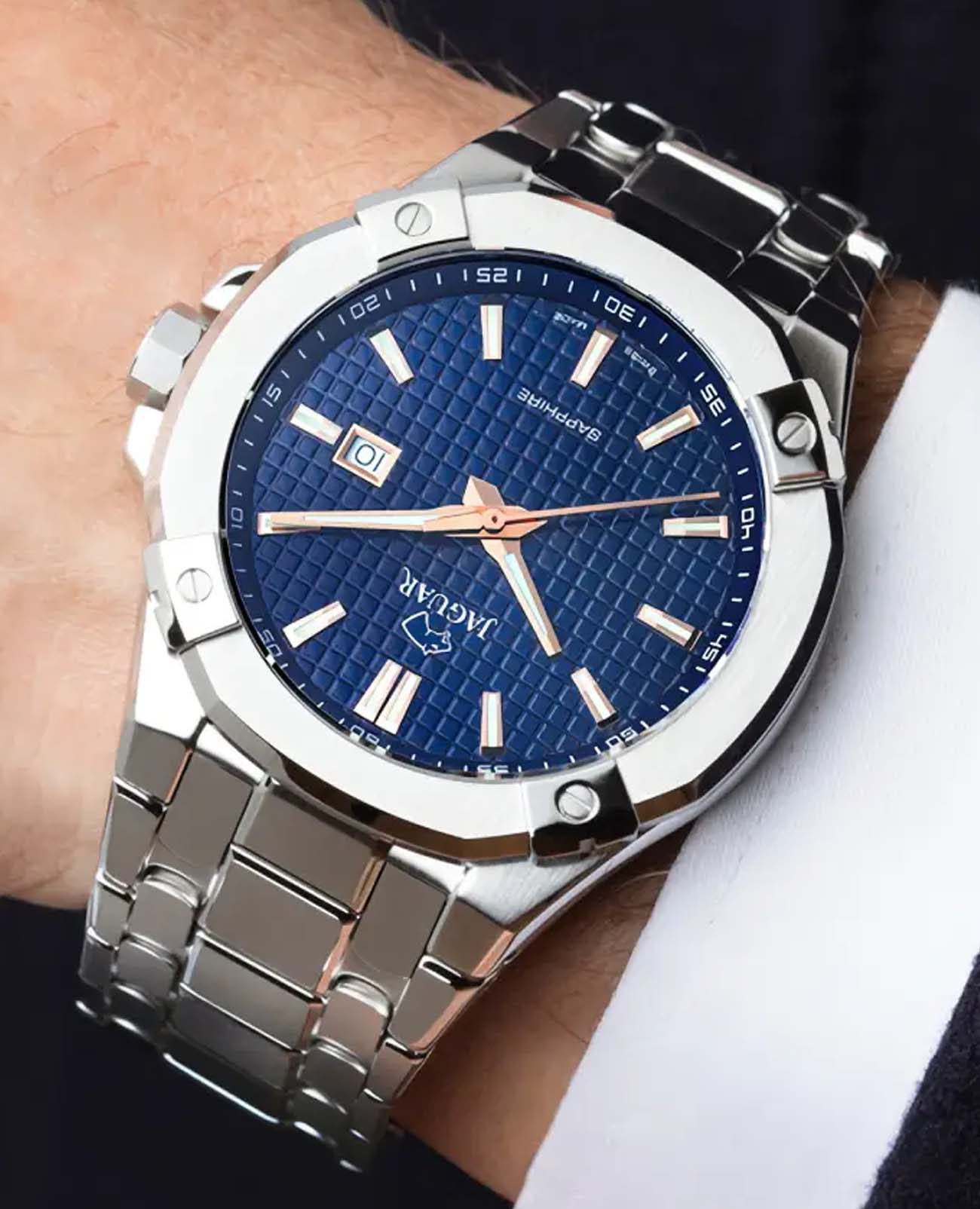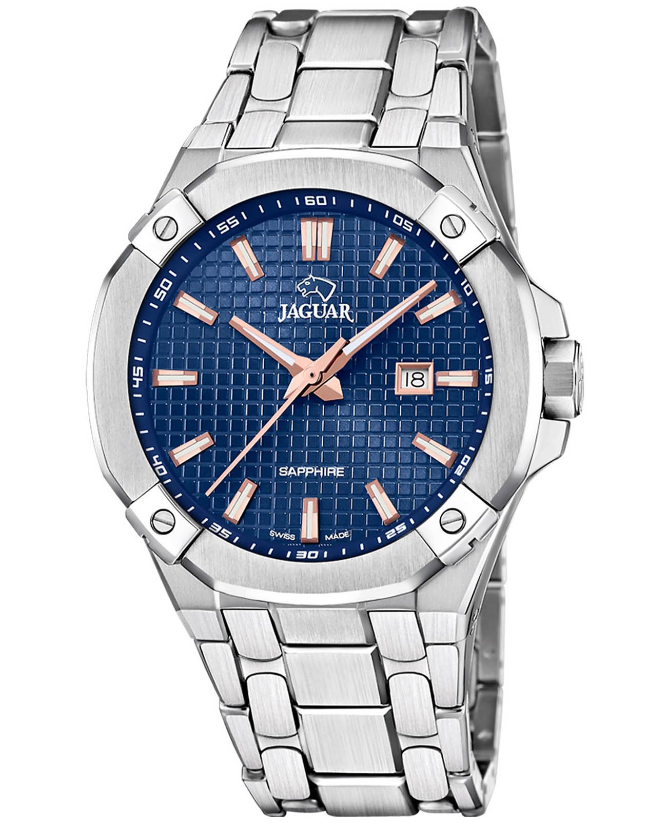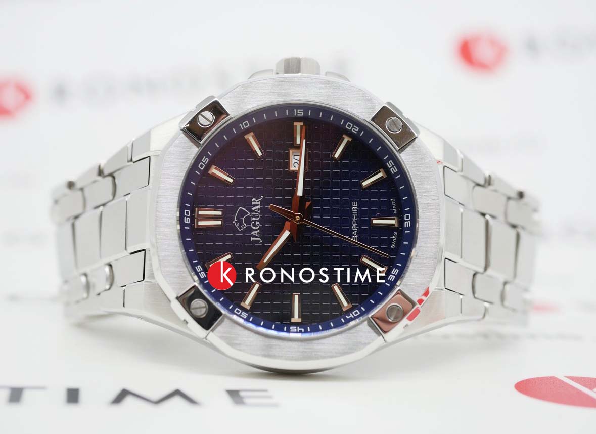 Мужские швейцарские часы JAGUAR Diplomatic J1009/2. Кварцевый швейцарский калибр Ronda 705. Сапфировое стеклоСапфировое стеклоПрочный и надёжный материал из кристалла сапфира синтетического происхождения, характеризующийся особой твёрдостью и устойчивостью к царапинам и повреждениям. устойчивое к мелким механическим повреждениям. Корпус и браслет часов изготовлены из нержавеющей стали. Стрелки и метки с люминесцентным покрытиемЛюминесцентное покрытиеПозволяет считывать показания времени в темноте. Производители наносят на стрелки, часовые индексы, безель или поверхность циферблата светонакопительный состав, дающий холодное свечение.. Окошко даты находится в положении 3 часа. Класс водозащиты: 100 метров, позволит плавать, нырять и заниматься другими водными видами спорта. Стальной браслет на раскладной застёжкеРаскладная застёжкаТакой тип застёжки используется только на браслетах из металла. Она никогда не раскрывается полностью, происходит разделение на 2 и более частей. Раскладывающая застёжка снизит вероятность потери часов к минимуму..