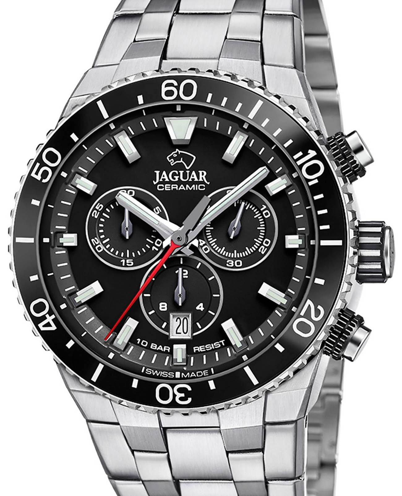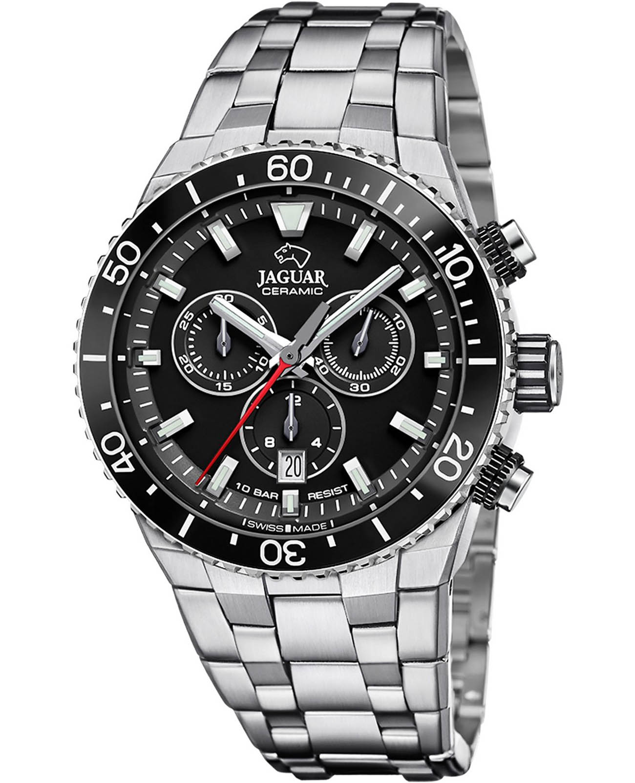 Мужские швейцарские часы-хронографХронографФункция позволяет измерять отрезки времени с особой точностью: часы, минуты, секунды. Верным признаком хронографа является наличие на циферблате 3 дополнительных окошек-счётчиков. Jaguar Ceramic J1022/4. Кварцевый швейцарский калибр Ronda 5030d. Сапфировое стеклоСапфировое стеклоПрочный и надёжный материал из кристалла сапфира синтетического происхождения, характеризующийся особой твёрдостью и устойчивостью к царапинам и повреждениям. устойчивое к мелким механическим повреждениям. Корпус часов изготовлен из нержавеющей стали. Стрелки и метки с люминесцентным покрытиемЛюминесцентное покрытиеПозволяет считывать показания времени в темноте. Производители наносят на стрелки, часовые индексы, безель или поверхность циферблата светонакопительный состав, дающий холодное свечение.. Окошко даты находится в положении 6 часов. Класс водозащиты: 100 метров, позволит плавать, нырять и заниматься другими водными видами спорта. БезельБезельВнешний ободок, закрепляющий стекло. В спортивных часах так называется поворотное кольцо с делениями на циферблате, выполняет роль таймера – замеряет отрезки времени на шкале. Неподвижный безель – элемент декора. Однонаправленно вращающийся безель на дайверских часах позволяет фиксировать моменты погружения и выныривания на поверхность. из высокотехнологичной керамикиВысокотехнологичная керамикаИнновационный запатентованный Rado материал с гладкой или матовой поверхностью. Керамика за счёт кристаллической структуры обладает повышенной устойчивостью от возникновения царапин. Материал способен принимать температуру тела человека, обеспечивая невероятный комфорт при ношении.. Стальной браслет на раскладной застёжкеРаскладная застёжкаТакой тип застёжки используется только на браслетах из металла. Она никогда не раскрывается полностью, происходит разделение на 2 и более частей. Раскладывающая застёжка снизит вероятность потери часов к минимуму..