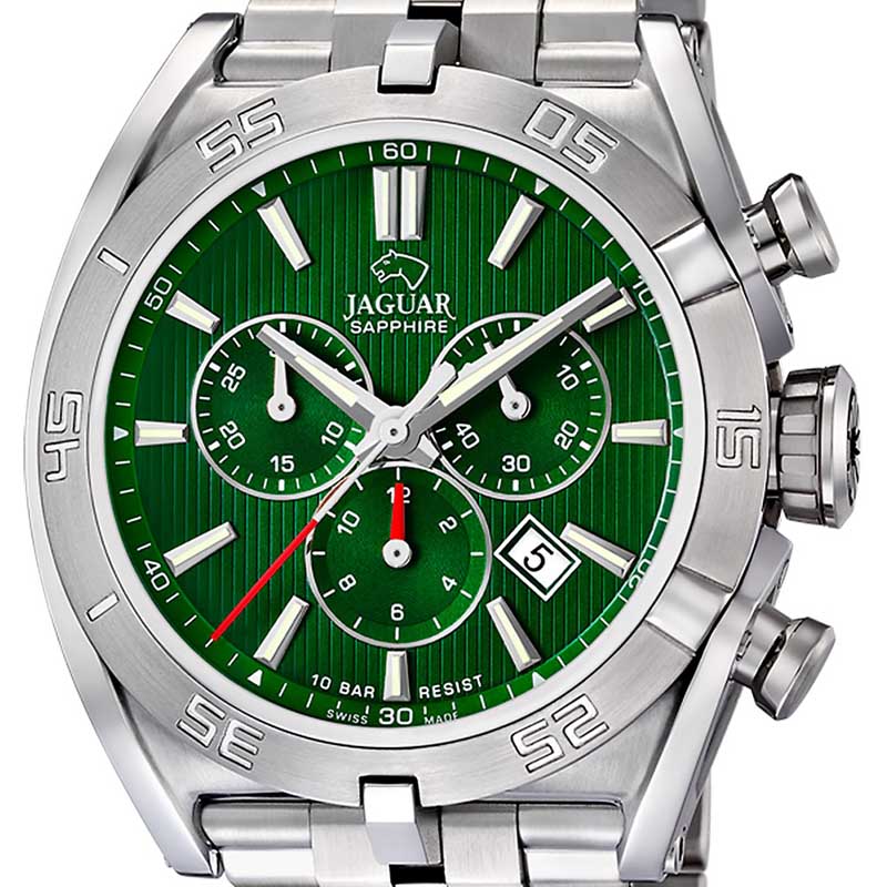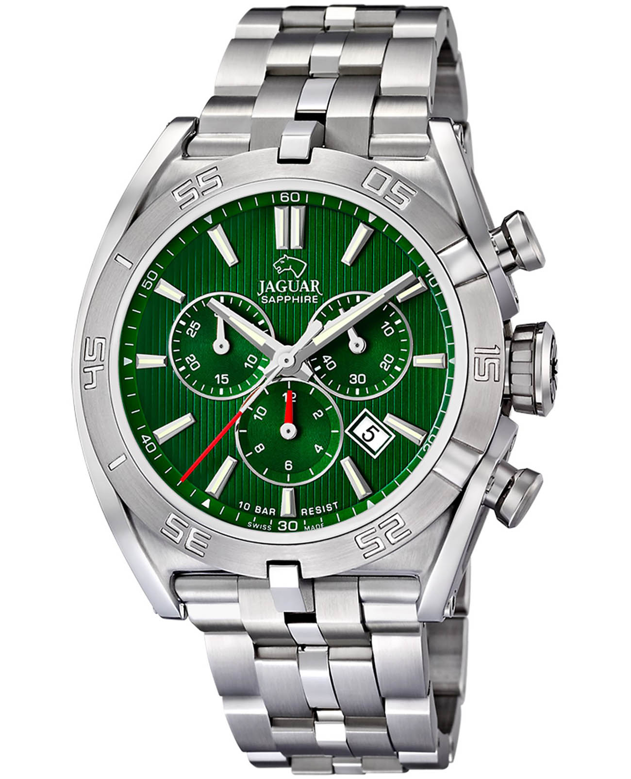 Мужские швейцарские часы-хронографХронографФункция позволяет измерять отрезки времени с особой точностью: часы, минуты, секунды. Верным признаком хронографа является наличие на циферблате 3 дополнительных окошек-счётчиков. Jaguar Executive J852/C. Кварцевый швейцарский калибр Ronda 5030d. Сапфировое стеклоСапфировое стеклоПрочный и надёжный материал из кристалла сапфира синтетического происхождения, характеризующийся особой твёрдостью и устойчивостью к царапинам и повреждениям. устойчивое к мелким механическим повреждениям. Корпус и браслет часов изготовлены из нержавеющей стали. Стрелки и метки с люминесцентным покрытиемЛюминесцентное покрытиеПозволяет считывать показания времени в темноте. Производители наносят на стрелки, часовые индексы, безель или поверхность циферблата светонакопительный состав, дающий холодное свечение.. Окошко даты находится в положении между «4» и «5 часами». Класс водозащиты: 100 метров, позволит плавать, нырять и заниматься другими водными видами спорта. Стальной браслет на раскладной застёжкеРаскладная застёжкаТакой тип застёжки используется только на браслетах из металла. Она никогда не раскрывается полностью, происходит разделение на 2 и более частей. Раскладывающая застёжка снизит вероятность потери часов к минимуму..