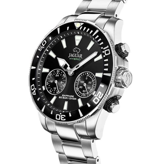 Браслет с раскладывающейся застёжкой обеспечивает удобство при ношении. БезельБезельВнешний ободок, закрепляющий стекло. В спортивных часах так называется поворотное кольцо с делениями на циферблате, выполняет роль таймера – замеряет отрезки времени на шкале. Неподвижный безель – элемент декора. Однонаправленно вращающийся безель на дайверских часах позволяет фиксировать моменты погружения и выныривания на поверхность. с PVD-покрытиемPVDУльтратонкое покрытие наносится в технике вакуумного напыления, сочетает в себе нитрид титана особой прочности со слоем золота или оксида хрома. Несёт в себе декоративную или защитную функцию., придающим часам стильный вид. Гибридный механизм швейцарского производства обеспечивает точность хода, а смарт-модуль позволяет подключать часы к телефону через Bluetooth и управлять функциями через приложение Jaguar.