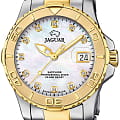 Женские швейцарские часы Jaguar Couple Diver J970/4. Кварцевый швейцарский калибр Ronda 6003.d. Сапфировое стеклоСапфировое стеклоПрочный и надёжный материал из кристалла сапфира синтетического происхождения, характеризующийся особой твёрдостью и устойчивостью к царапинам и повреждениям. устойчивое к мелким механическим повреждениям. Корпус часов изготовлен из нержавеющей стали. Циферблат декорирован вставками из циркония на метках времени. Стрелки и метки с люминесцентным покрытиемЛюминесцентное покрытиеПозволяет считывать показания времени в темноте. Производители наносят на стрелки, часовые индексы, безель или поверхность циферблата светонакопительный состав, дающий холодное свечение.. Окошко даты находится в положении 3 часа. Класс водозащиты: 200 метров, позволит плавать, нырять и заниматься другими водными видами спорта. Стальной браслет с частичным PVD-покрытиемPVDУльтратонкое покрытие наносится в технике вакуумного напыления, сочетает в себе нитрид титана особой прочности со слоем золота или оксида хрома. Несёт в себе декоративную или защитную функцию. на раскладной застёжкеРаскладная застёжкаТакой тип застёжки используется только на браслетах из металла. Она никогда не раскрывается полностью, происходит разделение на 2 и более частей. Раскладывающая застёжка снизит вероятность потери часов к минимуму.. БезельБезельВнешний ободок, закрепляющий стекло. В спортивных часах так называется поворотное кольцо с делениями на циферблате, выполняет роль таймера – замеряет отрезки времени на шкале. Неподвижный безель – элемент декора. Однонаправленно вращающийся безель на дайверских часах позволяет фиксировать моменты погружения и выныривания на поверхность. с PVD-покрытиемPVDУльтратонкое покрытие наносится в технике вакуумного напыления, сочетает в себе нитрид титана особой прочности со слоем золота или оксида хрома. Несёт в себе декоративную или защитную функцию..