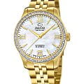 Женские швейцарские часы Jaguar Automatic Woman J999/1, механизм — автоподзавод. В часах с автоподзаводом заводная головка практически не используется, что исключает истирание ее материала и материала корпуса. Сапфировое стеклоСапфировое стеклоПрочный и надёжный материал из кристалла сапфира синтетического происхождения, характеризующийся особой твёрдостью и устойчивостью к царапинам и повреждениям. устойчивое к мелким механическим повреждениям. Корпус часов изготовлен из нержавеющей стали с PVD-покрытиемPVDУльтратонкое покрытие наносится в технике вакуумного напыления, сочетает в себе нитрид титана особой прочности со слоем золота или оксида хрома. Несёт в себе декоративную или защитную функцию.. Класс водозащиты: 50 метров, позволит защитить корпус от случайных брызг или капель дождя. Стальной браслет с PVD-покрытиемPVDУльтратонкое покрытие наносится в технике вакуумного напыления, сочетает в себе нитрид титана особой прочности со слоем золота или оксида хрома. Несёт в себе декоративную или защитную функцию. на застёжке-бабочке с кнопкамиЗастёжка "бабочка"Такой вид застёжки дополняется предохранителями, помогающими избежать случайного раскрытия браслета. Обладают изящным исполнением. . БезельБезельВнешний ободок, закрепляющий стекло. В спортивных часах так называется поворотное кольцо с делениями на циферблате, выполняет роль таймера – замеряет отрезки времени на шкале. Неподвижный безель – элемент декора. Однонаправленно вращающийся безель на дайверских часах позволяет фиксировать моменты погружения и выныривания на поверхность. с PVD-покрытиемPVDУльтратонкое покрытие наносится в технике вакуумного напыления, сочетает в себе нитрид титана особой прочности со слоем золота или оксида хрома. Несёт в себе декоративную или защитную функцию. инкрустирован цирконием.