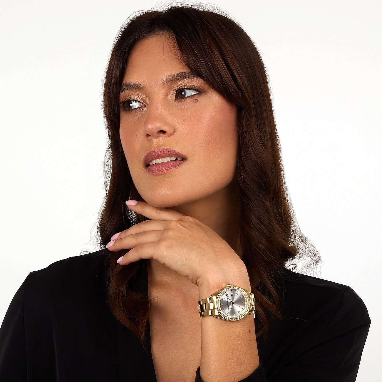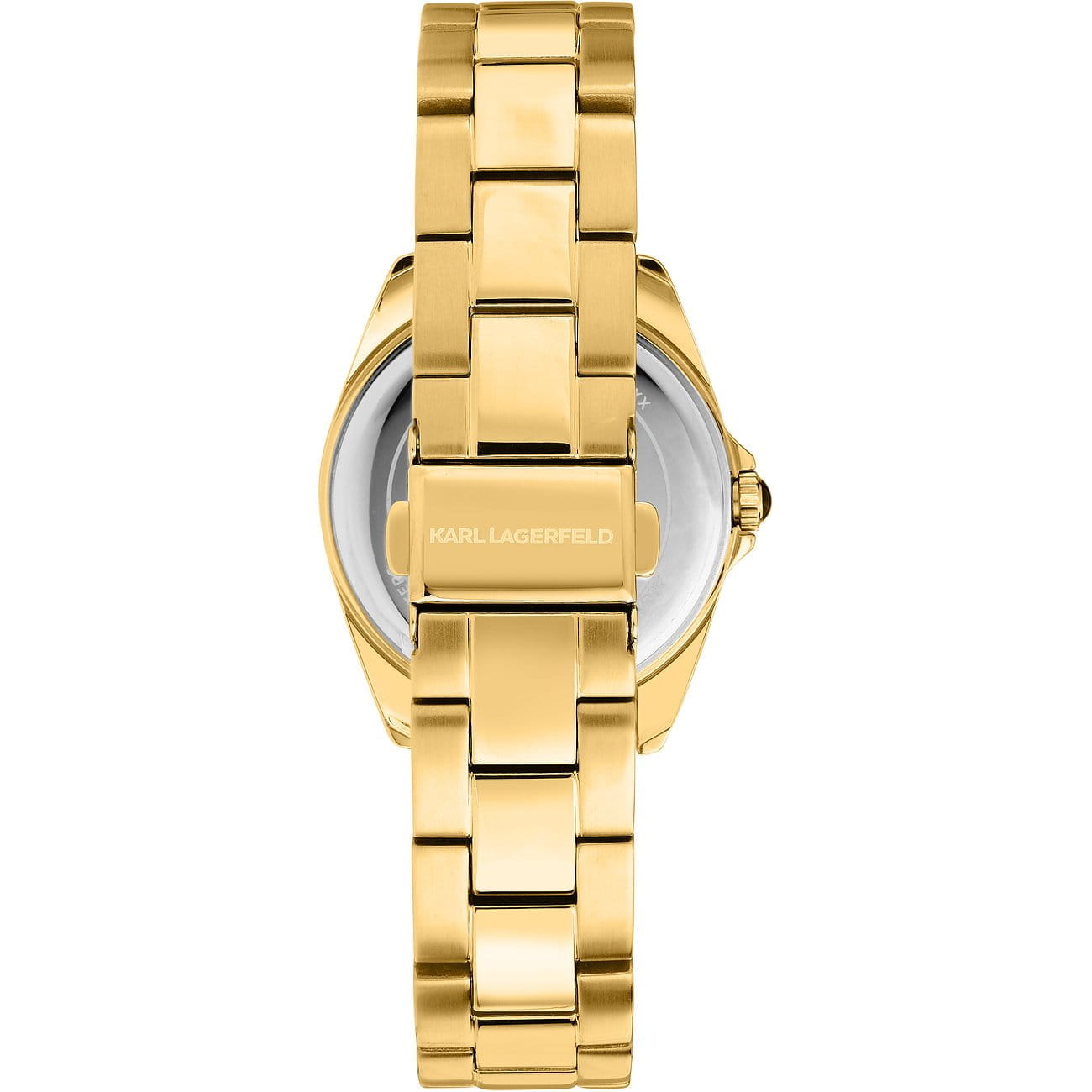 Женские элегантные часы Karl Lagerfeld Round Essentials R0553101505, кварцевый механизм с высокой точностью. Минеральное стеклоМинеральное стеклоМинеральное стекло представляет собой искусственно выращенный минерал кварца. Такое стекло отличается особой устойчивостью к повреждениям и царапинам. Уступает по некоторым качествам сапфировому стеклу. устойчивое к появлению царапин, обладающее высокой прозрачностью. Изысканный корпус изготовлен из нержавеющей стали с IP-покрытиемIP-покрытиеМетод ионного напыления. Демонстрирует повышенную устойчивость к истиранию, окислению и химическим веществам. Под воздействием высокого давления и температуры около 1500°C молекулы металла надёжно соединяются с частицами корпуса часов.. Лаконичные центральные часовая, минутная и секундная стрелки. Водонепроницаемость 5 АТМ позволяет использовать часы в повседневных условиях — при мытье рук или под лёгким дождём. Стальной браслет с IP-покрытиемIP-покрытиеМетод ионного напыления. Демонстрирует повышенную устойчивость к истиранию, окислению и химическим веществам. Под воздействием высокого давления и температуры около 1500°C молекулы металла надёжно соединяются с частицами корпуса часов. c раскладной застёжкойРаскладная застёжкаТакой тип застёжки используется только на браслетах из металла. Она никогда не раскрывается полностью, происходит разделение на 2 и более частей. Раскладывающая застёжка снизит вероятность потери часов к минимуму., обеспечивающей комфорт и уверенную фиксацию на запястье, а также добавляя завершающий штрих к этому стильному аксессуару. Стрелки оснащены люминесцентным покрытиемЛюминесцентное покрытиеПозволяет считывать показания времени в темноте. Производители наносят на стрелки, часовые индексы, безель или поверхность циферблата светонакопительный состав, дающий холодное свечение., обеспечивающим хорошую читаемость в темноте. Циферблат и безельБезельВнешний ободок, закрепляющий стекло. В спортивных часах так называется поворотное кольцо с делениями на циферблате, выполняет роль таймера – замеряет отрезки времени на шкале. Неподвижный безель – элемент декора. Однонаправленно вращающийся безель на дайверских часах позволяет фиксировать моменты погружения и выныривания на поверхность. с кристаллами подчёркивают изысканный характер часов, создавая универсальный образ, подходящий как для повседневных ситуаций, так и для особых случаев. Аккуратное окошко даты на отметке «3 часов».