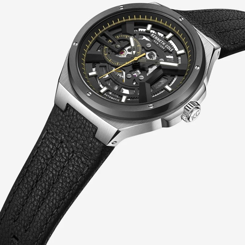 Мужские механические часы-скелетоны с минеральным стекломМинеральное стеклоМинеральное стекло представляет собой искусственно выращенный минерал кварца. Такое стекло отличается особой устойчивостью к повреждениям и царапинам. Уступает по некоторым качествам сапфировому стеклу. Kenneth Cole New York KCWGE0013701, механический механизм (автоматический калибр) с высокой точностью. Класс водозащиты: 30 метров, позволит защитить корпус от случайных брызг или капель дождя. Корпус часов изготовлен из стали. Кожаный ремешок на стандартной застёжке. Стрелки и метки с люминесцентным покрытиемЛюминесцентное покрытиеПозволяет считывать показания времени в темноте. Производители наносят на стрелки, часовые индексы, безель или поверхность циферблата светонакопительный состав, дающий холодное свечение.. БезельБезельВнешний ободок, закрепляющий стекло. В спортивных часах так называется поворотное кольцо с делениями на циферблате, выполняет роль таймера – замеряет отрезки времени на шкале. Неподвижный безель – элемент декора. Однонаправленно вращающийся безель на дайверских часах позволяет фиксировать моменты погружения и выныривания на поверхность. с PVD-покрытиемPVDУльтратонкое покрытие наносится в технике вакуумного напыления, сочетает в себе нитрид титана особой прочности со слоем золота или оксида хрома. Несёт в себе декоративную или защитную функцию..
