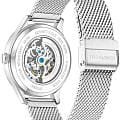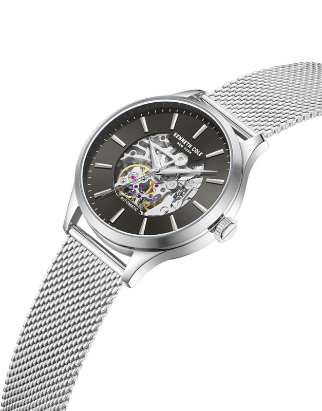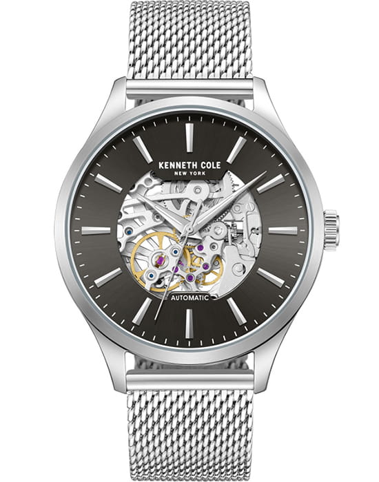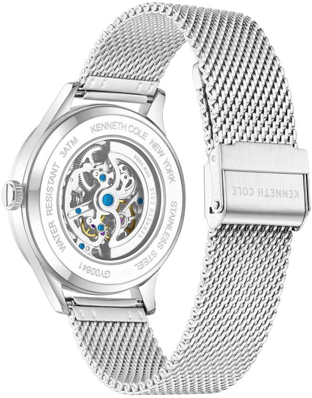 Kenneth Cole KCWGY0064102 — мужская автоматическая модель с эффектным современным дизайном и открытым скелетонизированным циферблатом. Корпус выполнен из нержавеющей стали и дополнен металлическим браслетом в стиле «миланская сетка», который обеспечивает комфортное прилегание и оснащён раскладным замкомРаскладной замокДанный вариант застежки используется только на часах с металлическим браслетом. Отличительная особенность такого крепления в том, что длина браслета становится универсальной и вы можете самостоятельно отрегулировать нужный вам размер – застежка просто двигается по браслету часов. для удобной фиксации. Конструкция циферблата открывает вид на работу автоматического механизма, позволяя наблюдать за его движением. Cтрелки покрыты люминесцентным покрытиемЛюминесцентное покрытиеПозволяет считывать показания времени в темноте. Производители наносят на стрелки, часовые индексы, безель или поверхность циферблата светонакопительный состав, дающий холодное свечение. для читаемости в условиях недостаточного освещения. Защитную функцию выполняет минеральное стеклоМинеральное стеклоМинеральное стекло представляет собой искусственно выращенный минерал кварца. Такое стекло отличается особой устойчивостью к повреждениям и царапинам. Уступает по некоторым качествам сапфировому стеклу., устойчивое к повседневным повреждениям. Водозащита 3 ATM защищает модель от случайных брызг и дождя.