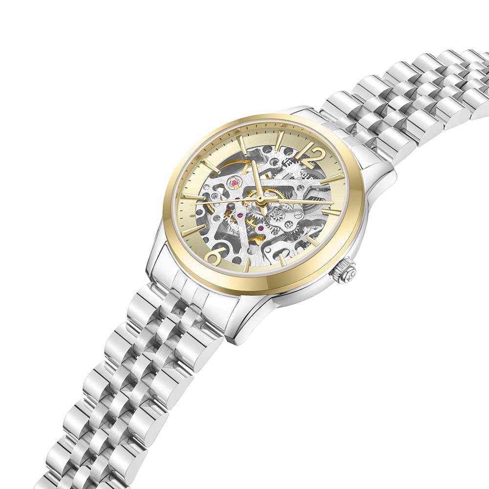 Женские механические часы с автоподзаводом Kenneth Cole KCWLL0047403 — это элегантный аксессуар, сочетающий женственность и современный дизайн. Корпус диаметром 36 мм выполнен из нержавеющей стали. Циферблат золотистого цвета частично скелетонизирован, что позволяет наблюдать за работой механизма, добавляя модели инженерной изысканности. Циферблат защищён минеральным стекломМинеральное стеклоМинеральное стекло представляет собой искусственно выращенный минерал кварца. Такое стекло отличается особой устойчивостью к повреждениям и царапинам. Уступает по некоторым качествам сапфировому стеклу. и оформлен метками в виде арабских цифр и штрихов. БезельБезельВнешний ободок, закрепляющий стекло. В спортивных часах так называется поворотное кольцо с делениями на циферблате, выполняет роль таймера – замеряет отрезки времени на шкале. Неподвижный безель – элемент декора. Однонаправленно вращающийся безель на дайверских часах позволяет фиксировать моменты погружения и выныривания на поверхность. с IP-покрытиемIP-покрытиеМетод ионного напыления. Демонстрирует повышенную устойчивость к истиранию, окислению и химическим веществам. Под воздействием высокого давления и температуры около 1500°C молекулы металла надёжно соединяются с частицами корпуса часов.. Часы оснащены стальным браслетом с раскладной застёжкойРаскладная застёжкаТакой тип застёжки используется только на браслетах из металла. Она никогда не раскрывается полностью, происходит разделение на 2 и более частей. Раскладывающая застёжка снизит вероятность потери часов к минимуму.. Водонепроницаемость 30 м позволяет использовать часы в повседневных условиях, защищая от случайных брызг и капель дождя. Сочетание лаконичного стиля и надёжного механизма делает эти часы универсальным выбором для повседневного и делового образа.