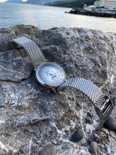 Российские мужские кварцевые часы Космос K 067.10.33 из коллекции Сатурн оснащены механизмом Miyota. Круглый корпус из нержавеющей стали 316L диаметром 41 мм и толщиной 13 мм защищен минеральным стекломМинеральное стеклоМинеральное стекло представляет собой искусственно выращенный минерал кварца. Такое стекло отличается особой устойчивостью к повреждениям и царапинам. Уступает по некоторым качествам сапфировому стеклу.. Серебристый циферблат с серыми элементами и градиентной шлифовкой в стиле солнечных лучей украшен изготовленными вручную индексами, крепящимися на двух штифтах. Часы имеют функции отображения даты центральной стрелкой, дня недели и индикатора фаз луны. Часовая, минутная стрелки, круг по краю циферблата и линия вокруг окошка индикатора фаз луны имеют люминесцентное покрытиеЛюминесцентное покрытиеПозволяет считывать показания времени в темноте. Производители наносят на стрелки, часовые индексы, безель или поверхность циферблата светонакопительный состав, дающий холодное свечение., которое светится в темноте, создавая эффект ореола вокруг Земли. На задней крышке выгравирован фантазийный сюжет — космическая станция будущего. Полированный корпус часов напоминает силуэт летающей тарелки благодаря выпуклым формам стекла и нижней части корпуса. Часы имеют водонепроницаемость 50 метров, позволит защитить корпус от случайных брызг или капель дождя. Модель комплектуется стальным браслетом миланского плетения на раскладном замкеРаскладной замокДанный вариант застежки используется только на часах с металлическим браслетом. Отличительная особенность такого крепления в том, что длина браслета становится универсальной и вы можете самостоятельно отрегулировать нужный вам размер – застежка просто двигается по браслету часов.. Эти часы сочетают в себе классический дизайн, современные технологии и футуристическое вдохновение, делая их идеальным выбором для ценителей точности и элегантности.