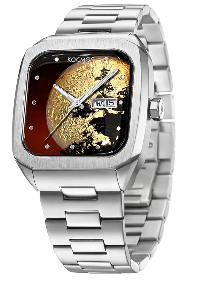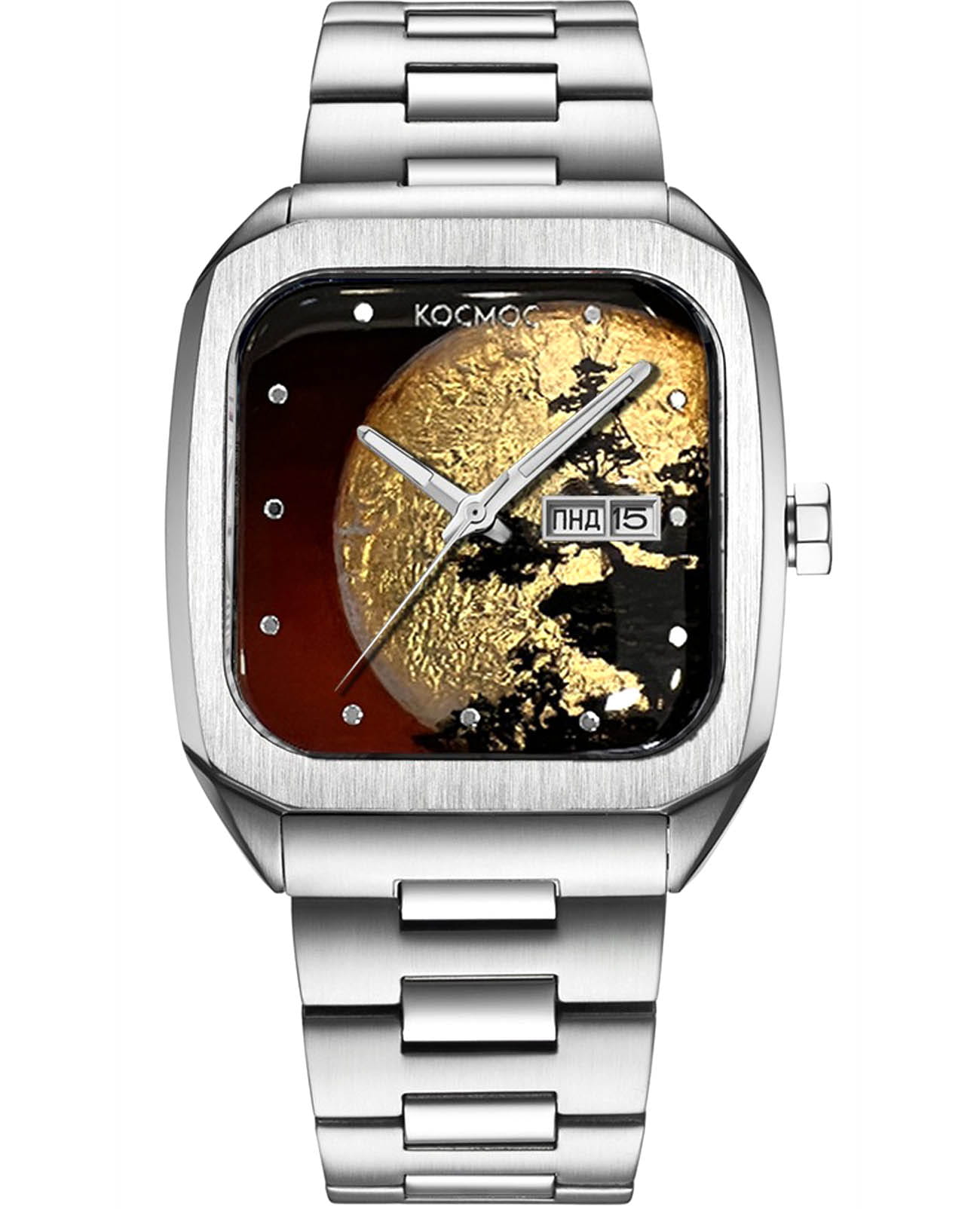 Мужские наручные часы Космос К 213.10 - Суперлуние — это уникальная модель. Суперлуние — это явление, когда полная Луна приближается к Земле на расстояние менее 362 тысяч километров. В это время она светится на одну треть ярче, а её диаметр увеличивается на 15%. Это невероятное астрономическое событие запечатлено в лаковой миниатюре на циферблате этих часов. Для создания этой уникальной модели часов мастера бренда выбрали технику лаковой миниатюры. На основу наносится несколько слоев лака и краски, их чередование создает объемный эффект и ощущение движения. Процесс постепенной прорисовки деталей довольно длительный: художнику требуется до 50 часов для завершения одного сюжета. Затем миниатюра запекается в специальной печи, что придаёт рисунку необходимую яркость и завершенность. Эти часы созданы в единственном экземпляре. В часах установлен механизм TMI с функцией автоподзавода. Они показывают часы, минуты и секунды, а также дату и день недели, индикатор которых с накладной рамкой расположен в положении «3 часа».  За движением деталей механизма можно наблюдать, стоит только перевернуть часы: задняя крышка прозрачная, закреплена на 4-х винтах. Часовая и минутная стрелки c люминесцентным покрытиемЛюминесцентное покрытиеПозволяет считывать показания времени в темноте. Производители наносят на стрелки, часовые индексы, безель или поверхность циферблата светонакопительный состав, дающий холодное свечение., которое светится в темноте. В модели установлено сапфировое стеклоСапфировое стеклоПрочный и надёжный материал из кристалла сапфира синтетического происхождения, характеризующийся особой твёрдостью и устойчивостью к царапинам и повреждениям. с антибликовым покрытиемАнтибликовое покрытиеСлой оксида металла в 0,13-0,3 микрон, благодаря которому стекло часов не бликует и не отражает свет. Антибликовое покрытие уменьшает отражение света в 10 раз, обеспечивая отличную читаемость показателей циферблата.. Браслет собран из стальных звеньев с полировкой и оснащен удобной застёжкой «бабочка» с кнопкамиЗастёжка "бабочка"Такой вид застёжки дополняется предохранителями, помогающими избежать случайного раскрытия браслета. Обладают изящным исполнением. , которая сводит к минимуму вероятность потери.